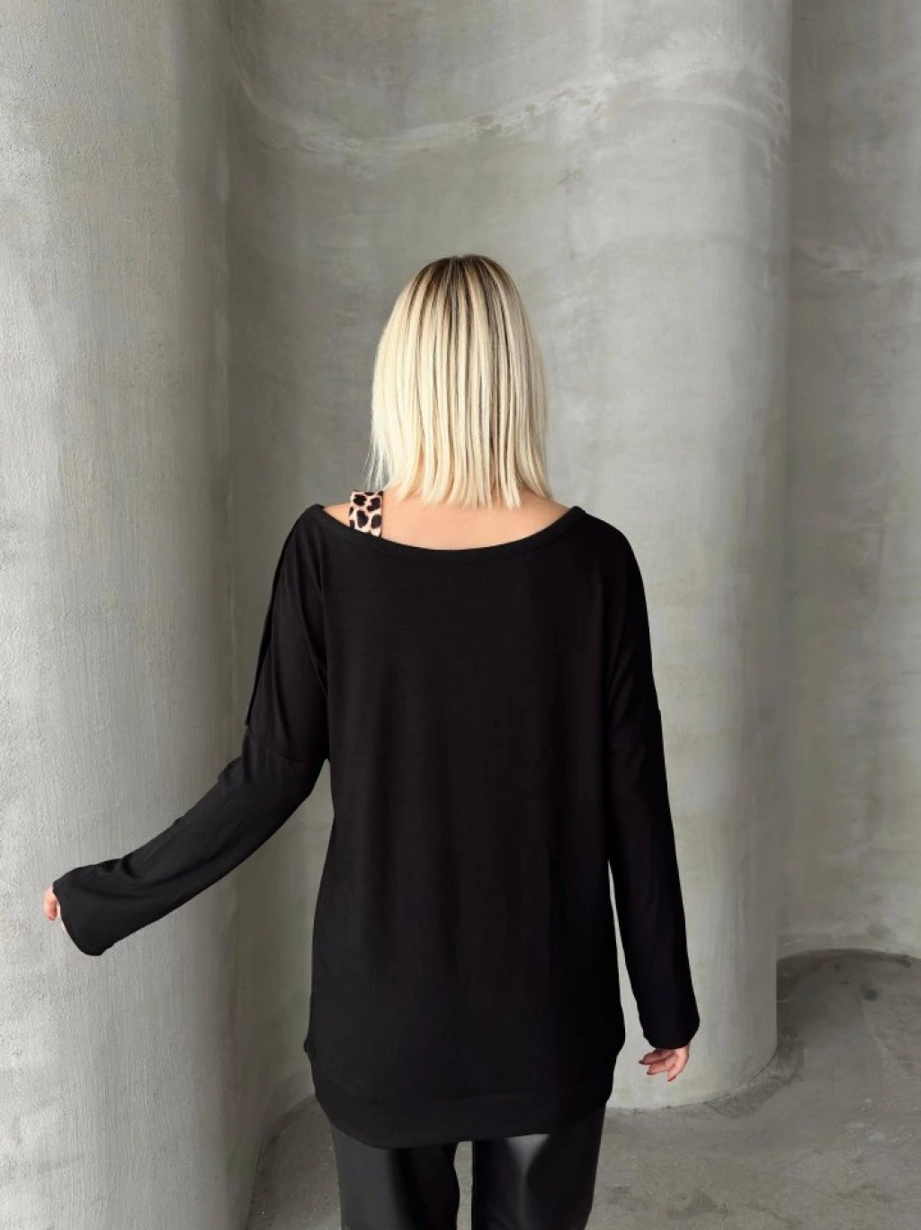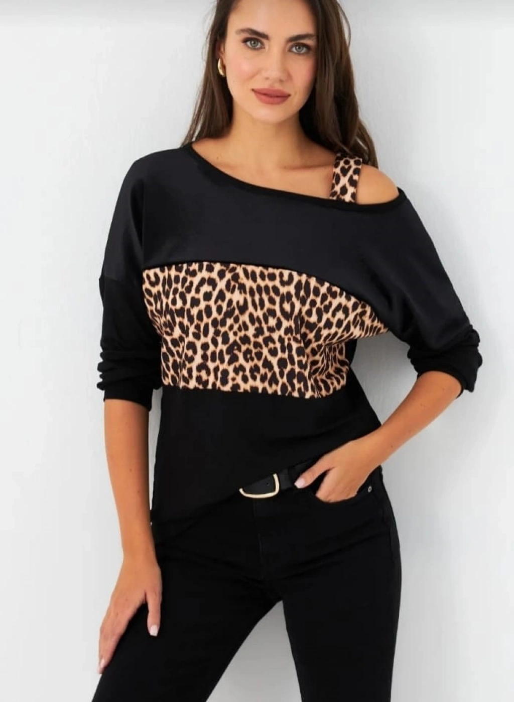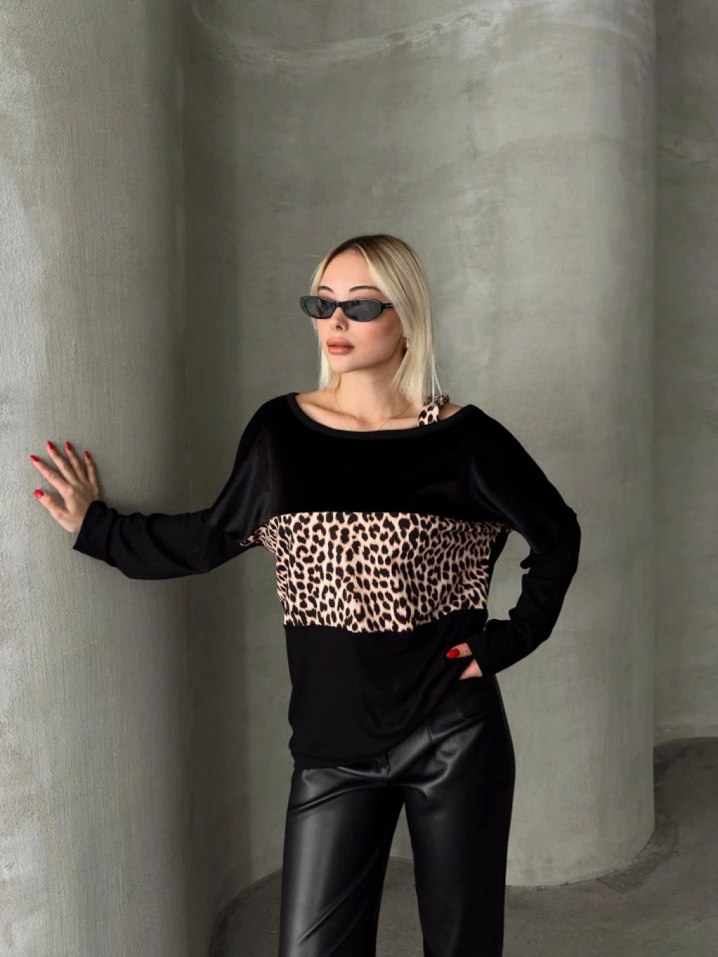 Kadın Kadife Kumaş Leopar Desenli Omuz Detay Uzun Kollu Bluz