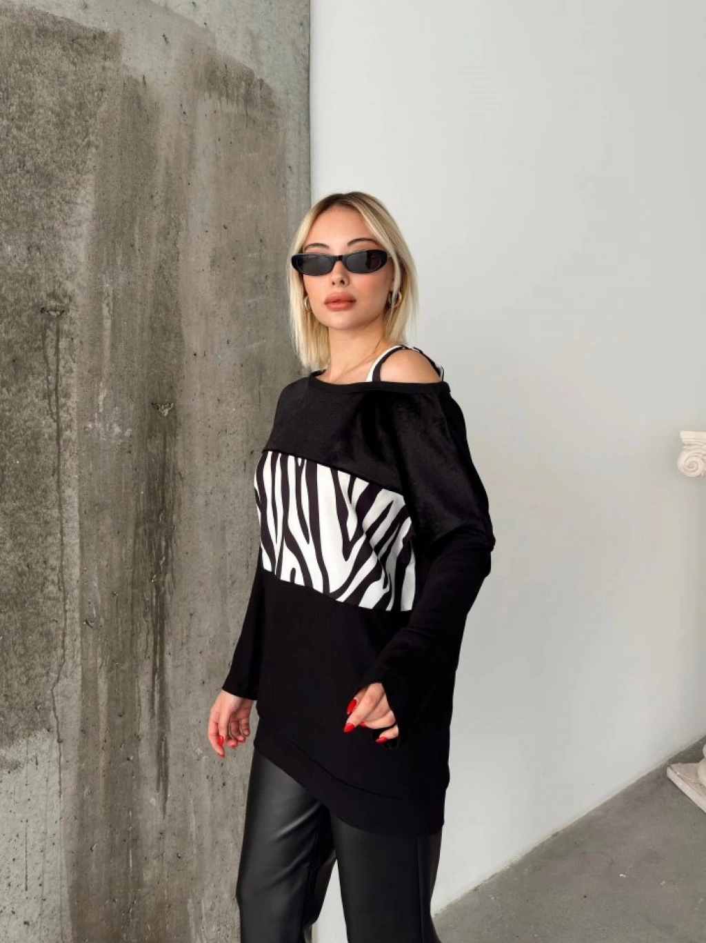 Kadın Kadife Kumaş Zebra Desenli Omuz Detay Uzun Kollu Bluz
