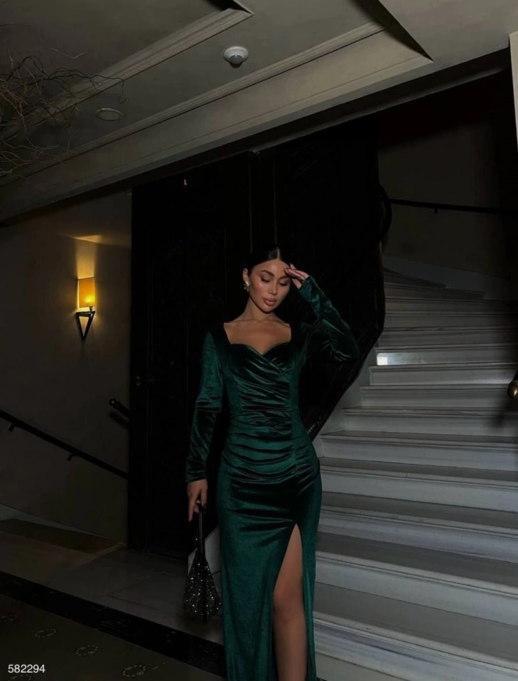 Kadın Kadife Kumaş Kalp Yaka Yırtmaç Detaylı Maxi Boy Elbise
