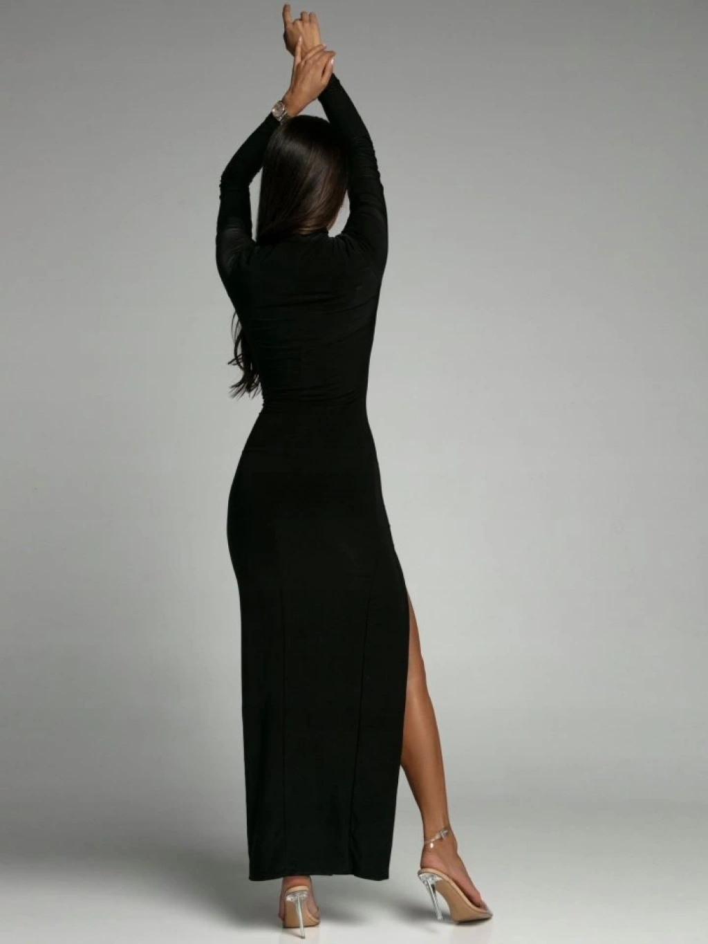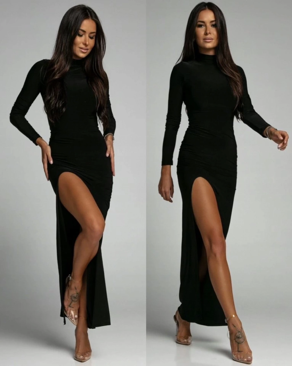 Kadın Uzun Kollu Yarım Balıkçı Yaka Derin Yırtmaç Detay Krep Tam Boy Elbise