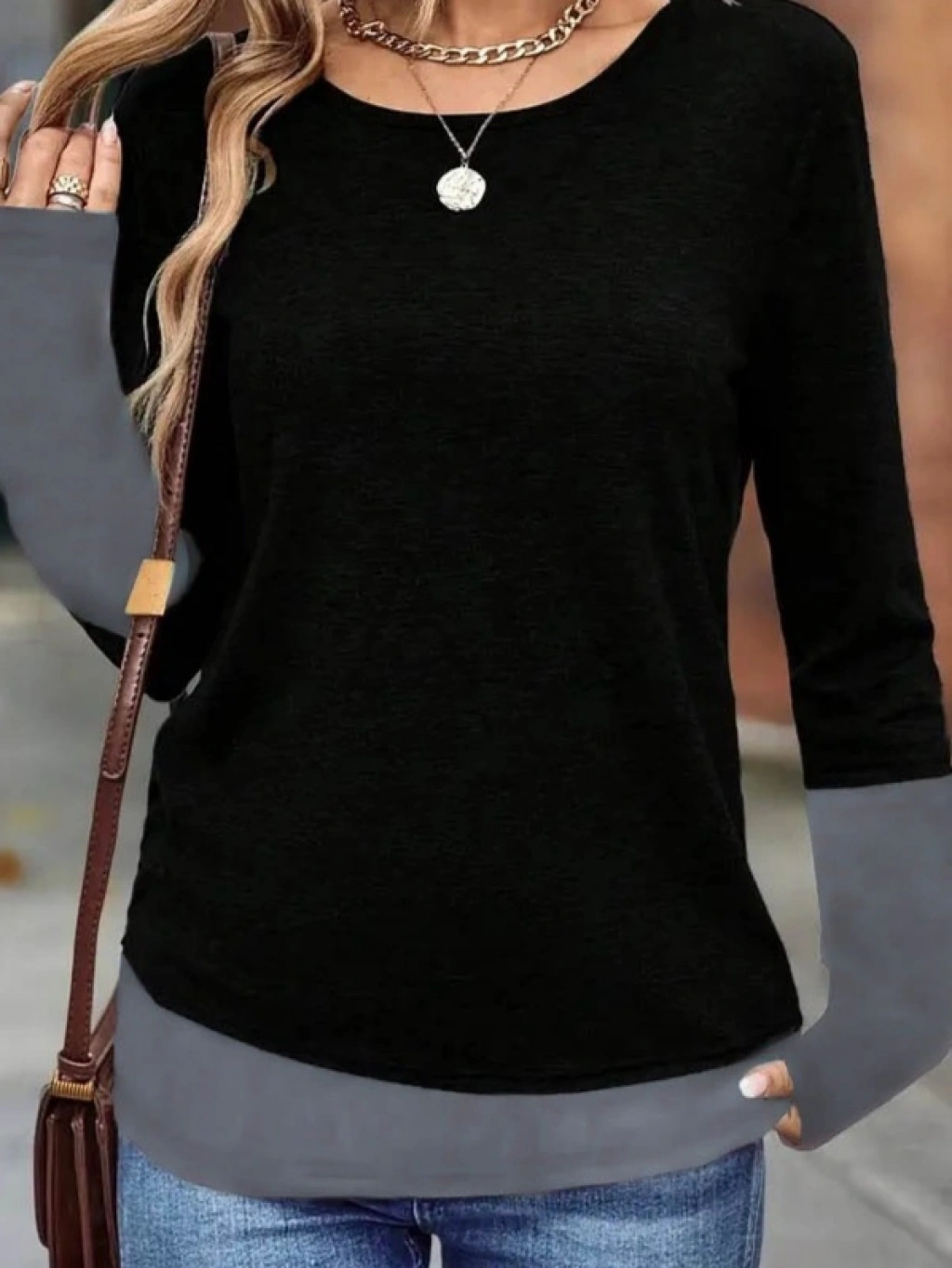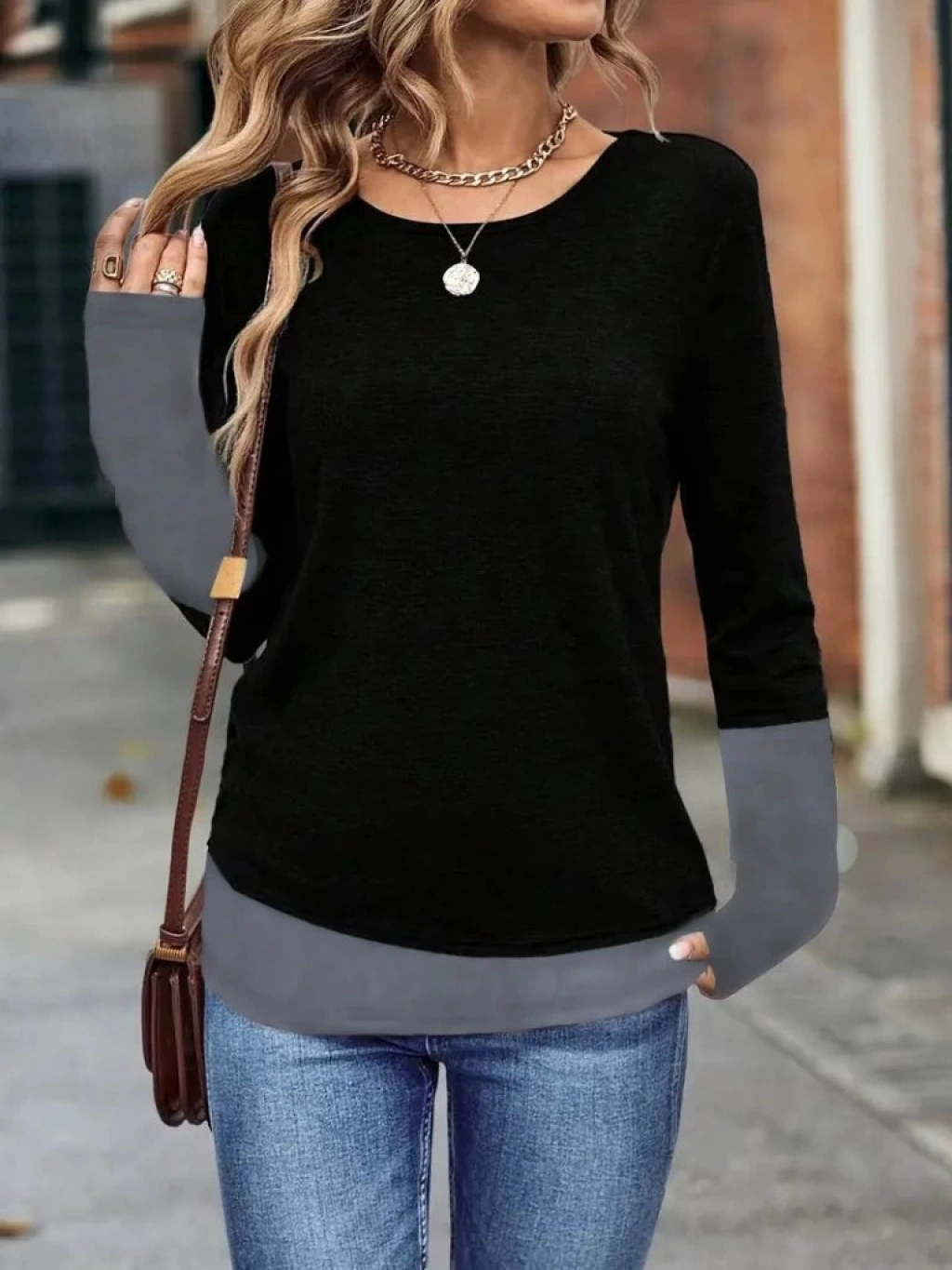 Kadın Uzun Kollu Açık Yuvarlak Yaka Blok Renkli Viskon Bluz