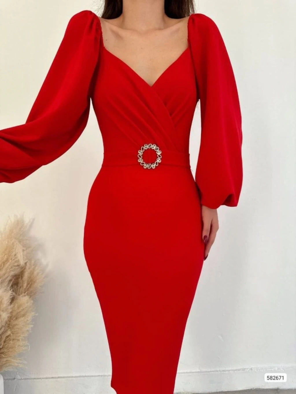 Kadın Kalp Yaka Sırt Dekolteli Kemer Toka Detay Midi Boy Elbise