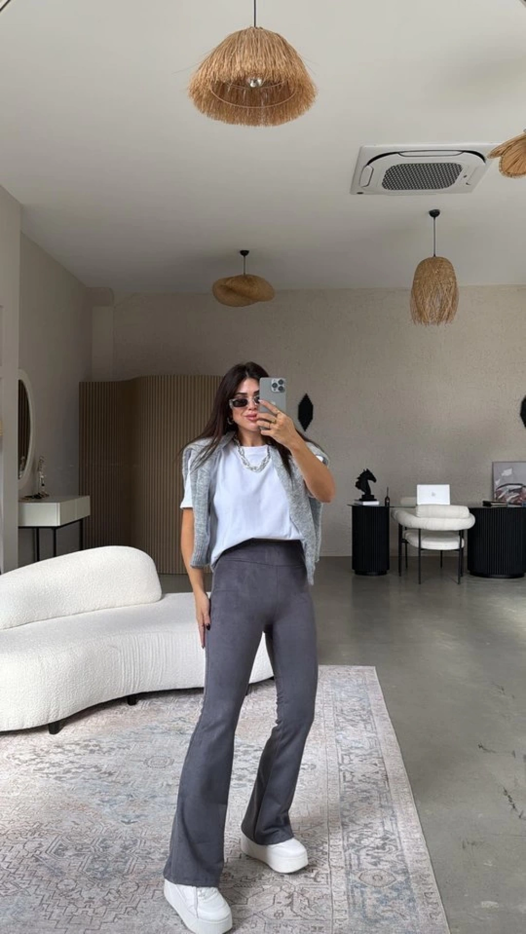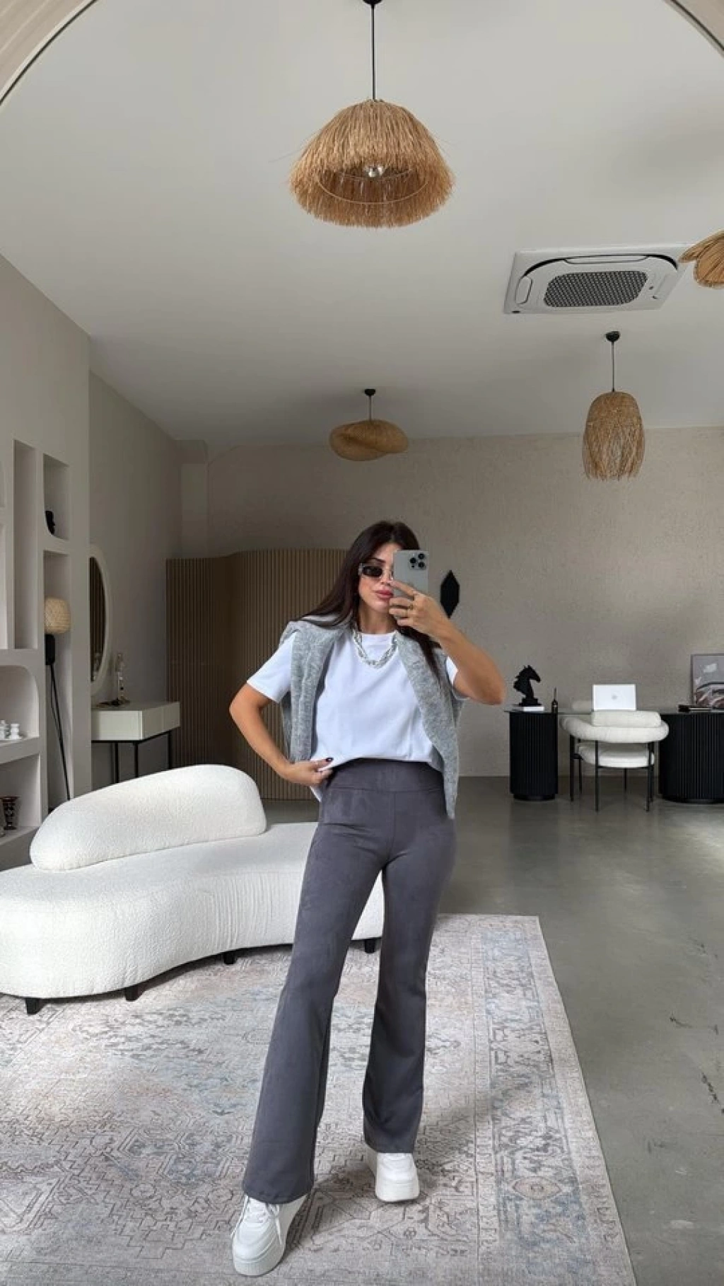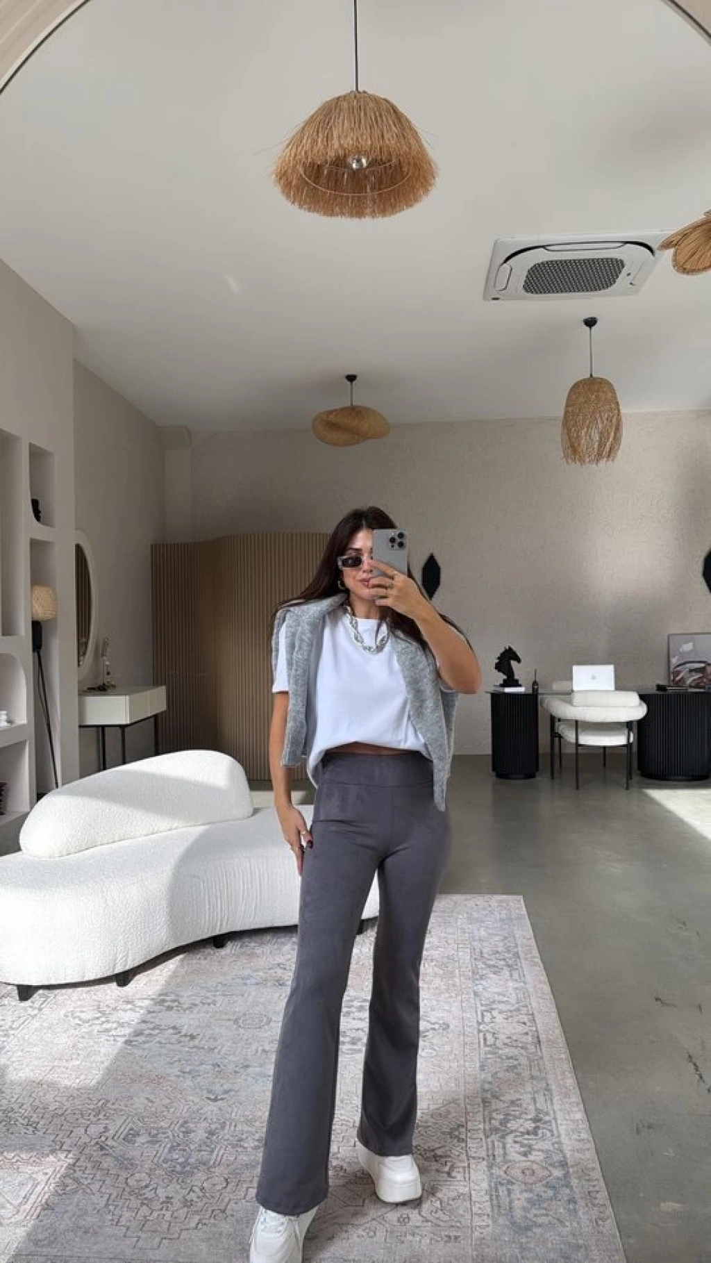 Kadın Yüksek Bel Süet Kumaş Ispanyol Paça Detay Pantolon