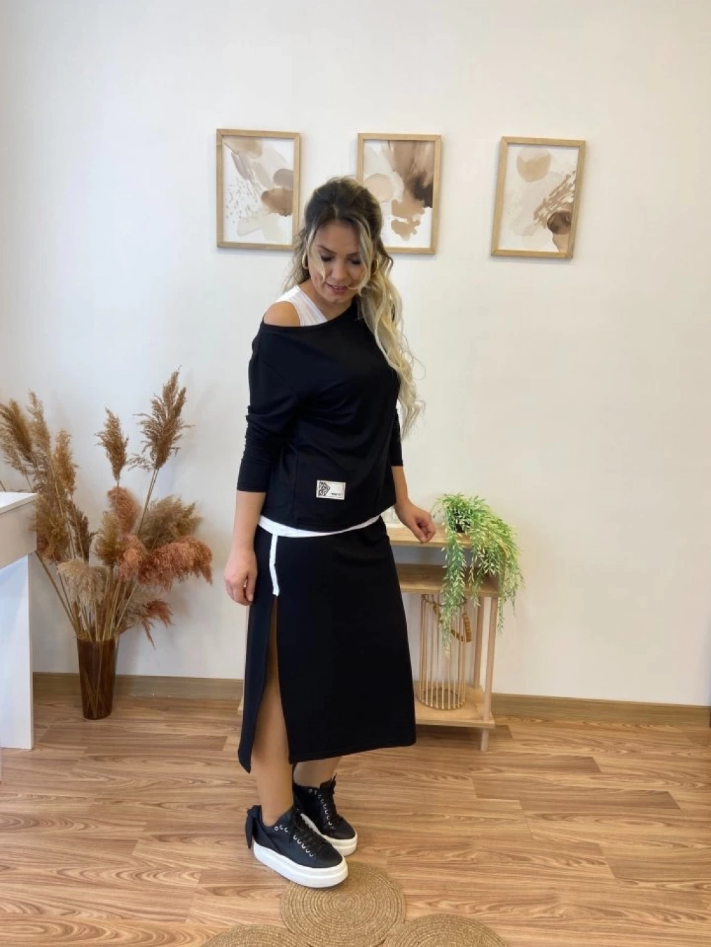 Kadın Uzun Kollu Tek Omuzu Açık Viskon Bluz Içi Atletli Ve Yandan şeritli üçlü Viskon Ikili Takım