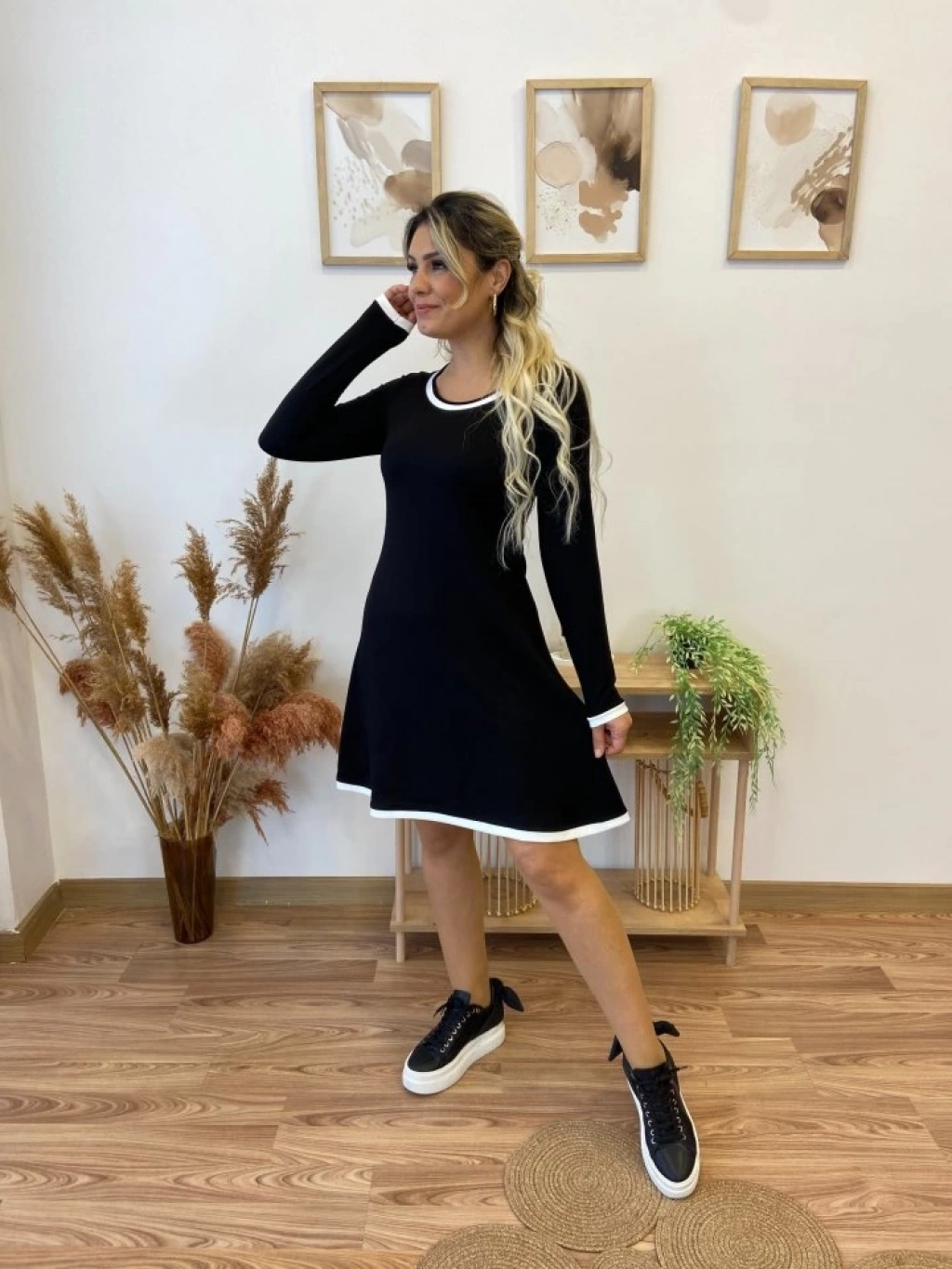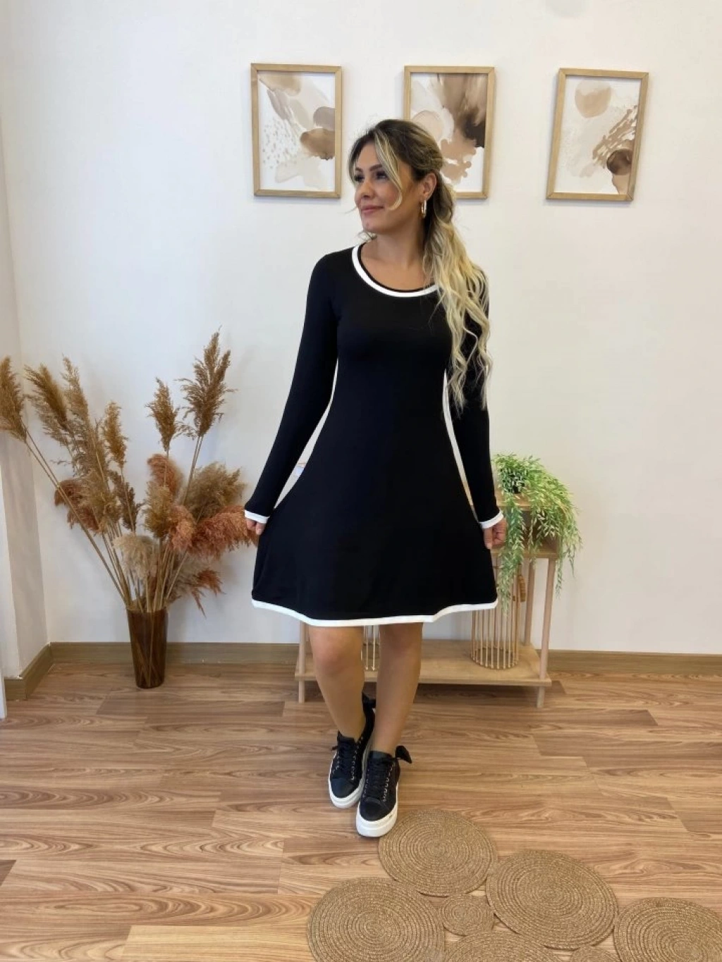 Kadın Uzun Kollu Derin Yuvarlak Yakalı Kısa Viskon Iki Iplik Elbise