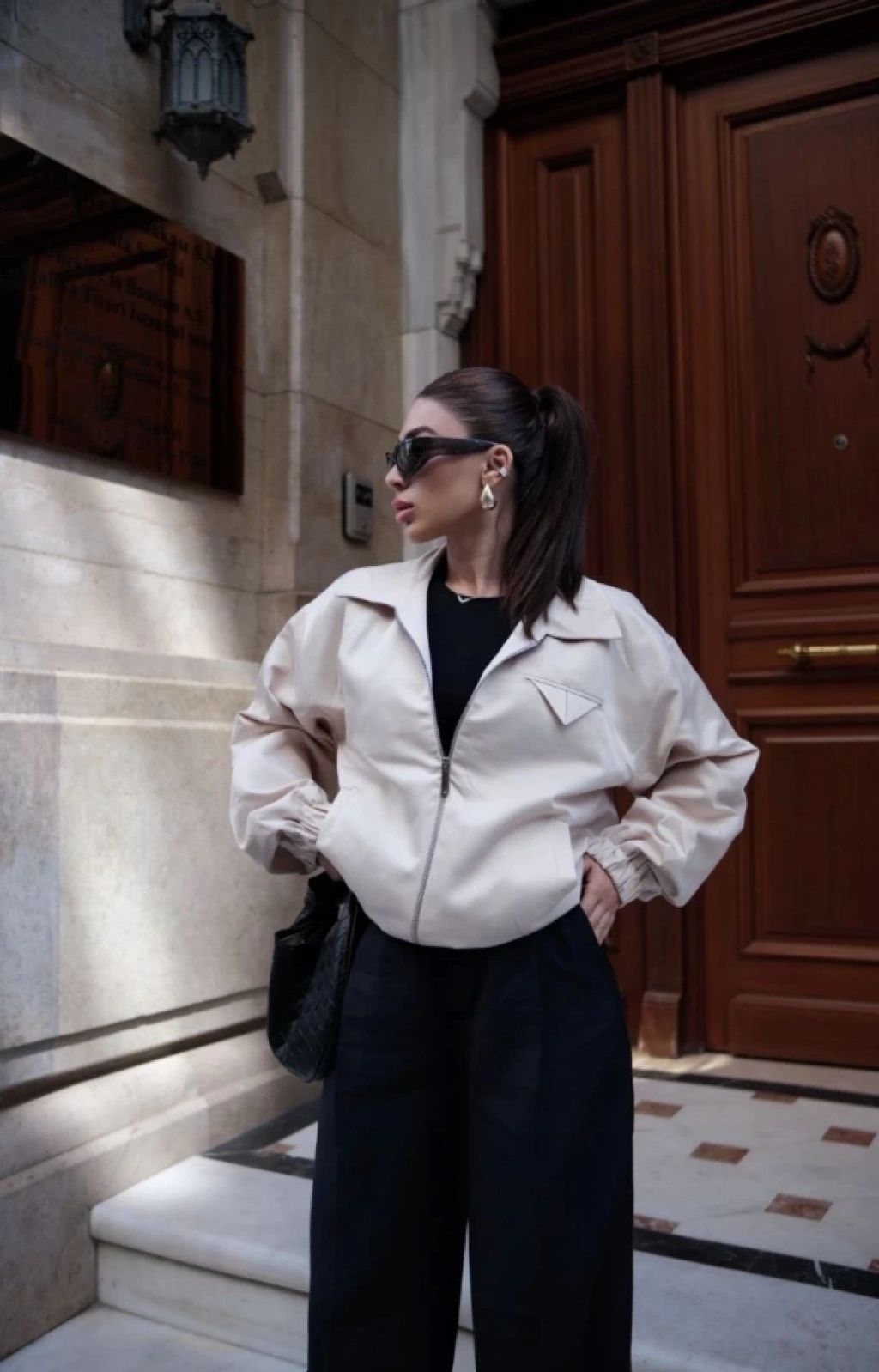 Fermuarlı Gömlek Yaka Bomber Ceket - Beyaz