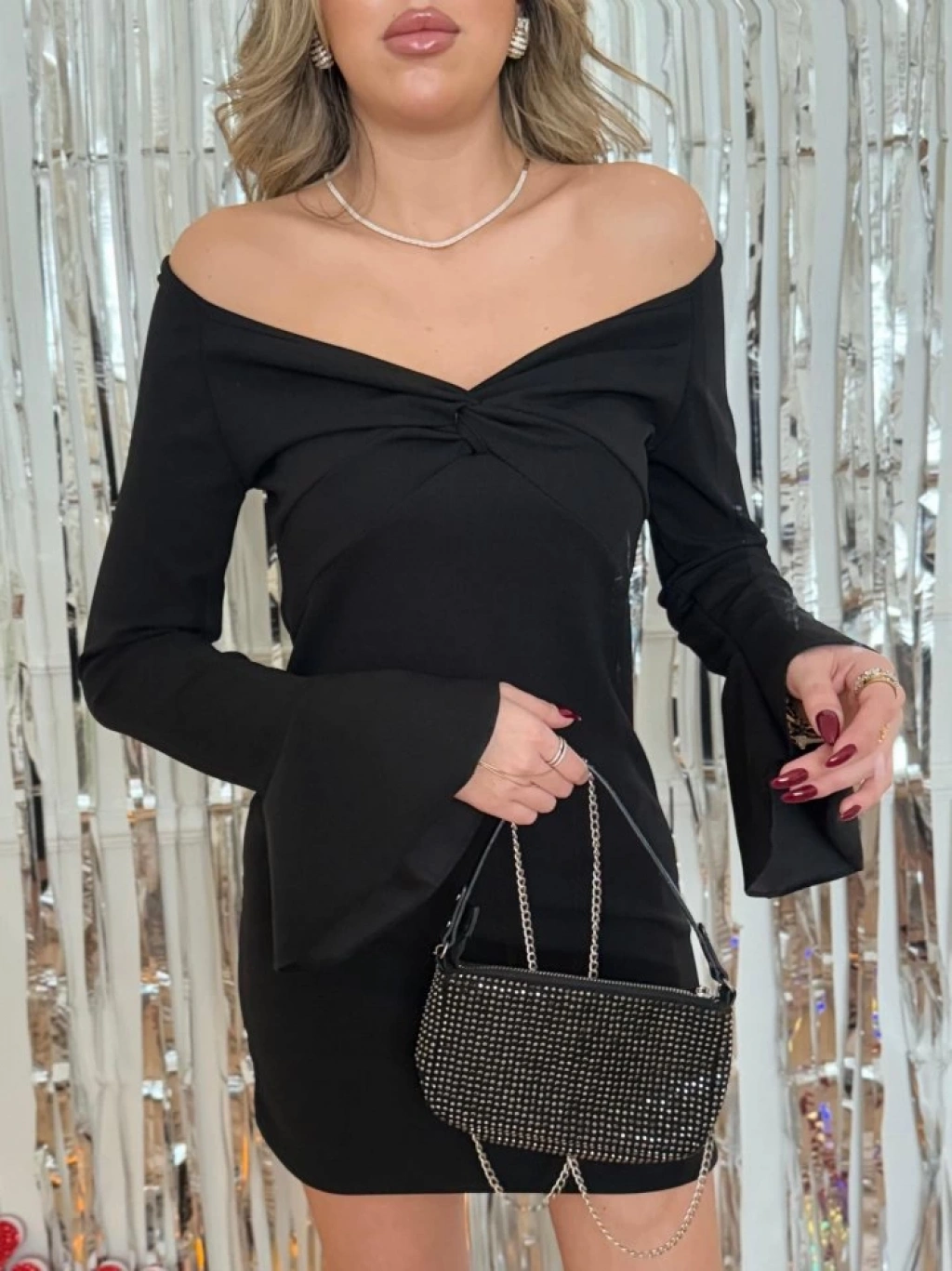 Kadın Yolbaşı özel Uzun Kollu çapraz Derin Dekolte Detaylı Ithal Krep Kısa Elbise