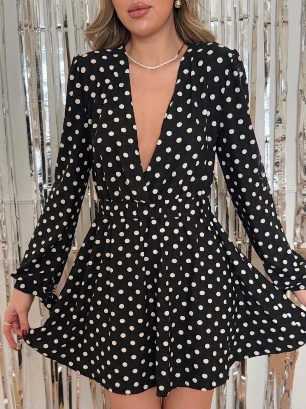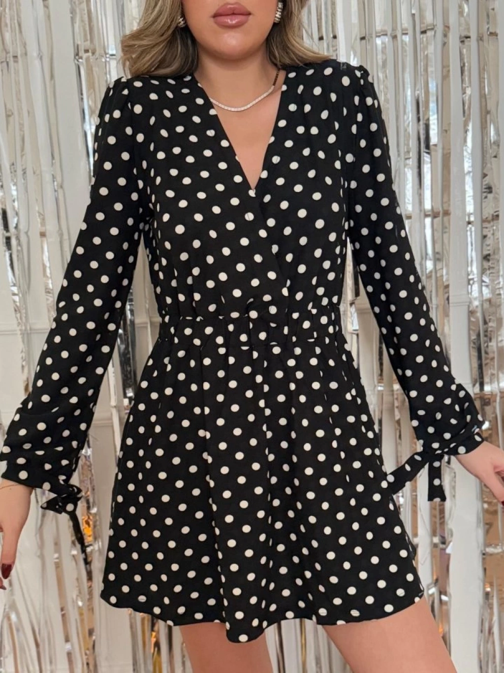 Kadın Yılbaşı özel Uzun Kollu Kruvaze Yaka Puantiyeli Desen Krep Mini Boy Elbise