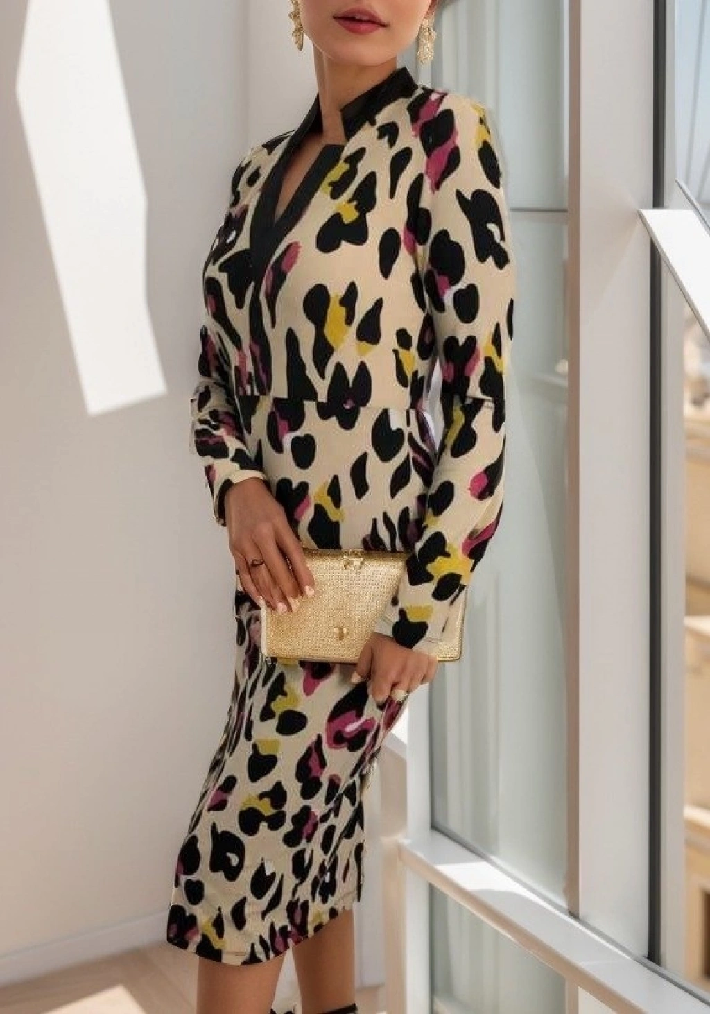 Kadın Uzun Kollu V Yaka Puantiyeli Krep Midi Boy Elbise
