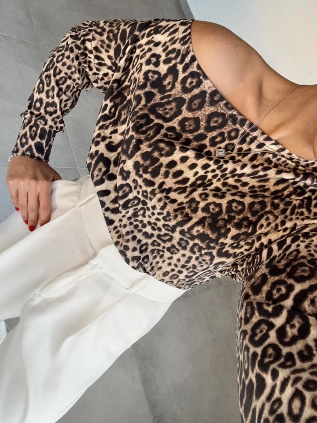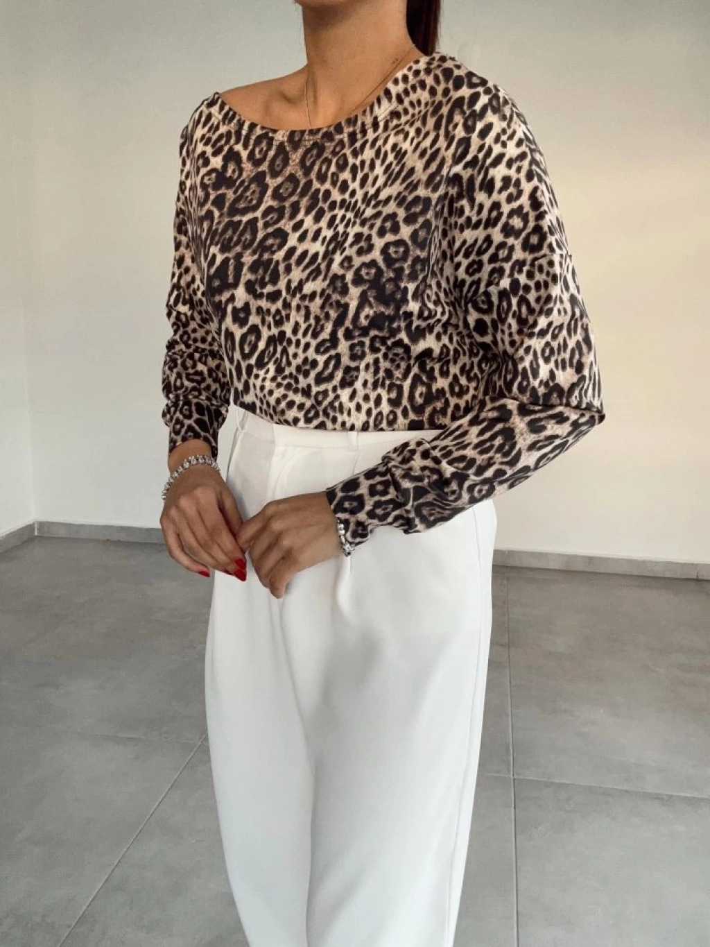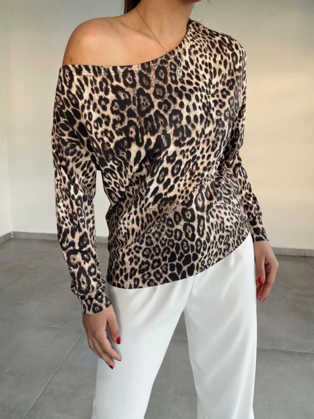 Kadın Uzun Kollu Kayık Yaka Detay Leopar Desen Bluz