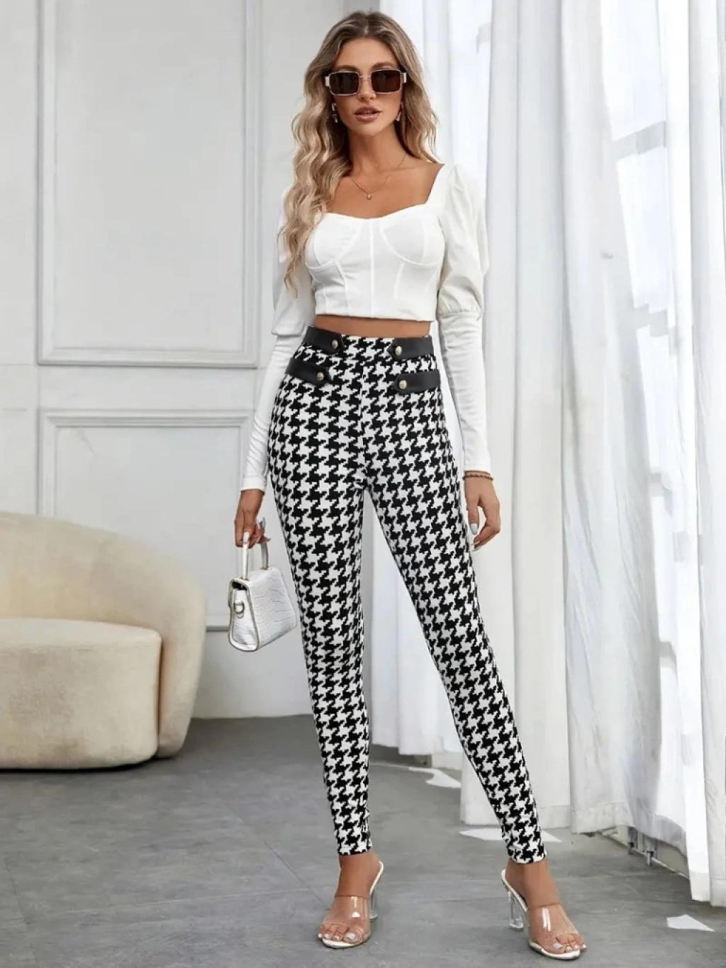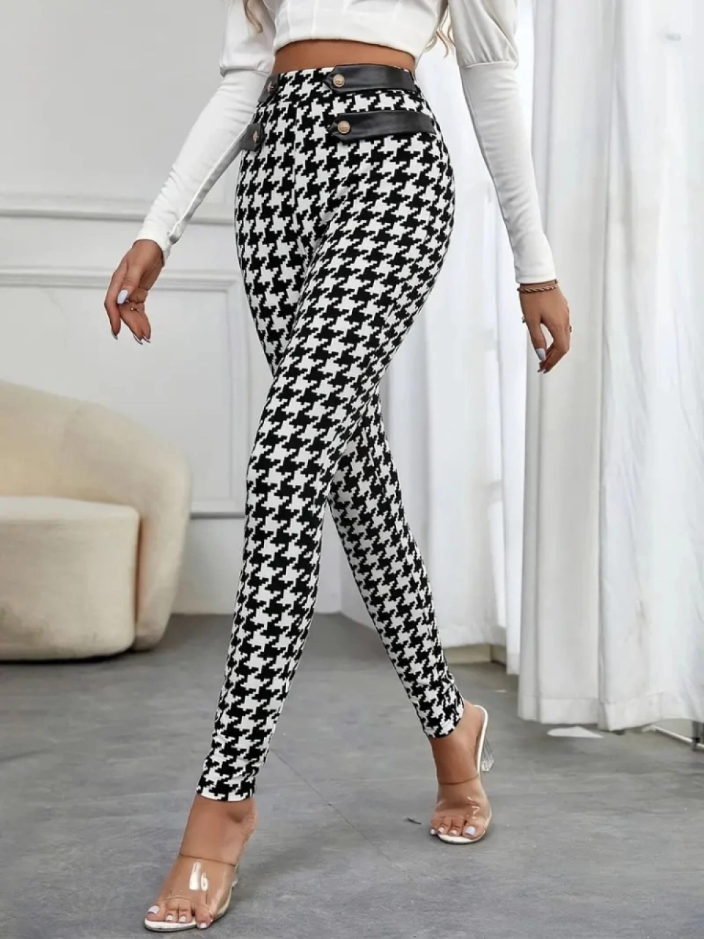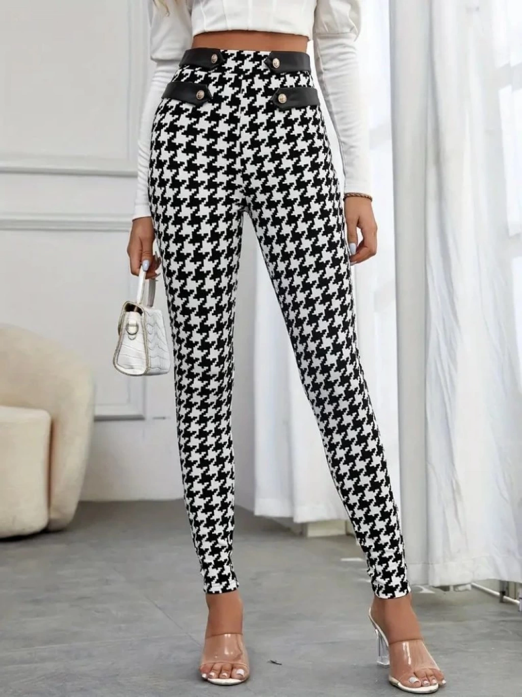 Kadın Yüksek Bel Kaz Ayağı Desenli Yan şerit Düğme Detaylı Dalgıç Pantolon