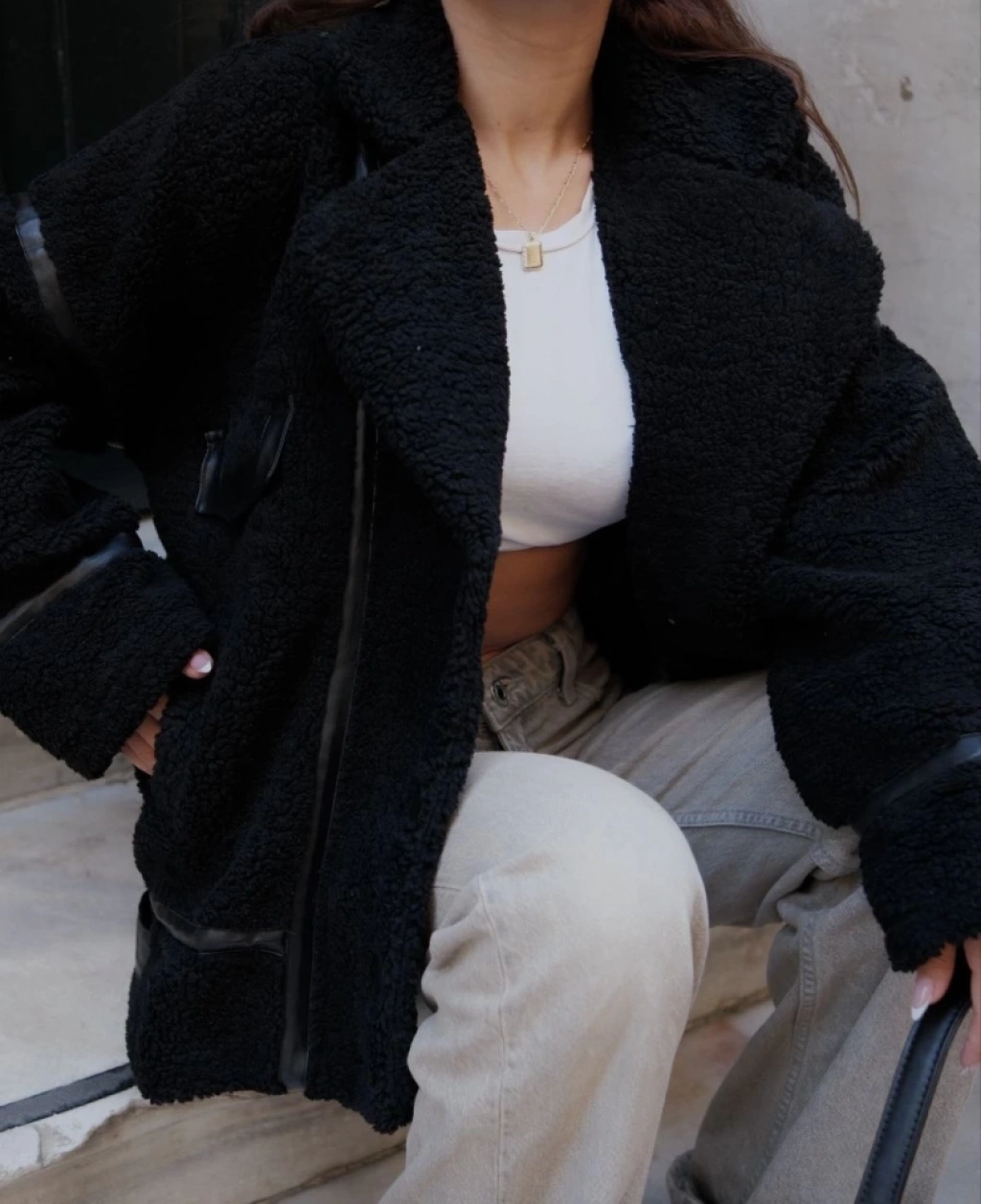 Cıt Cıt Detaylı Peluş Mont Ceket - Siyah