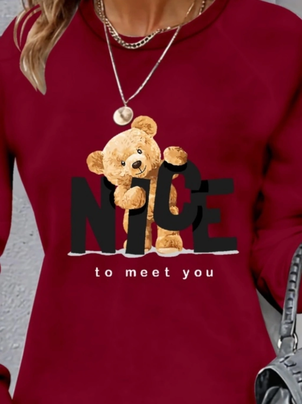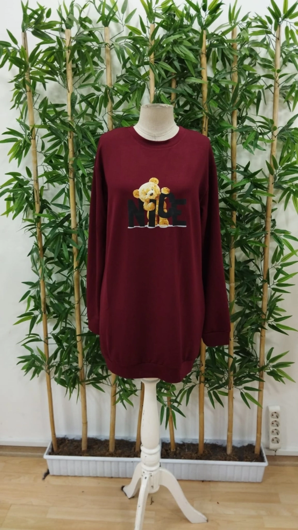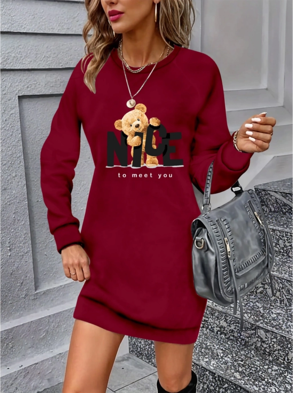 Kadın Uzun Kollu Bisiklet Yaka Ayı Desenli Viskon Iki Iplik Elbise
