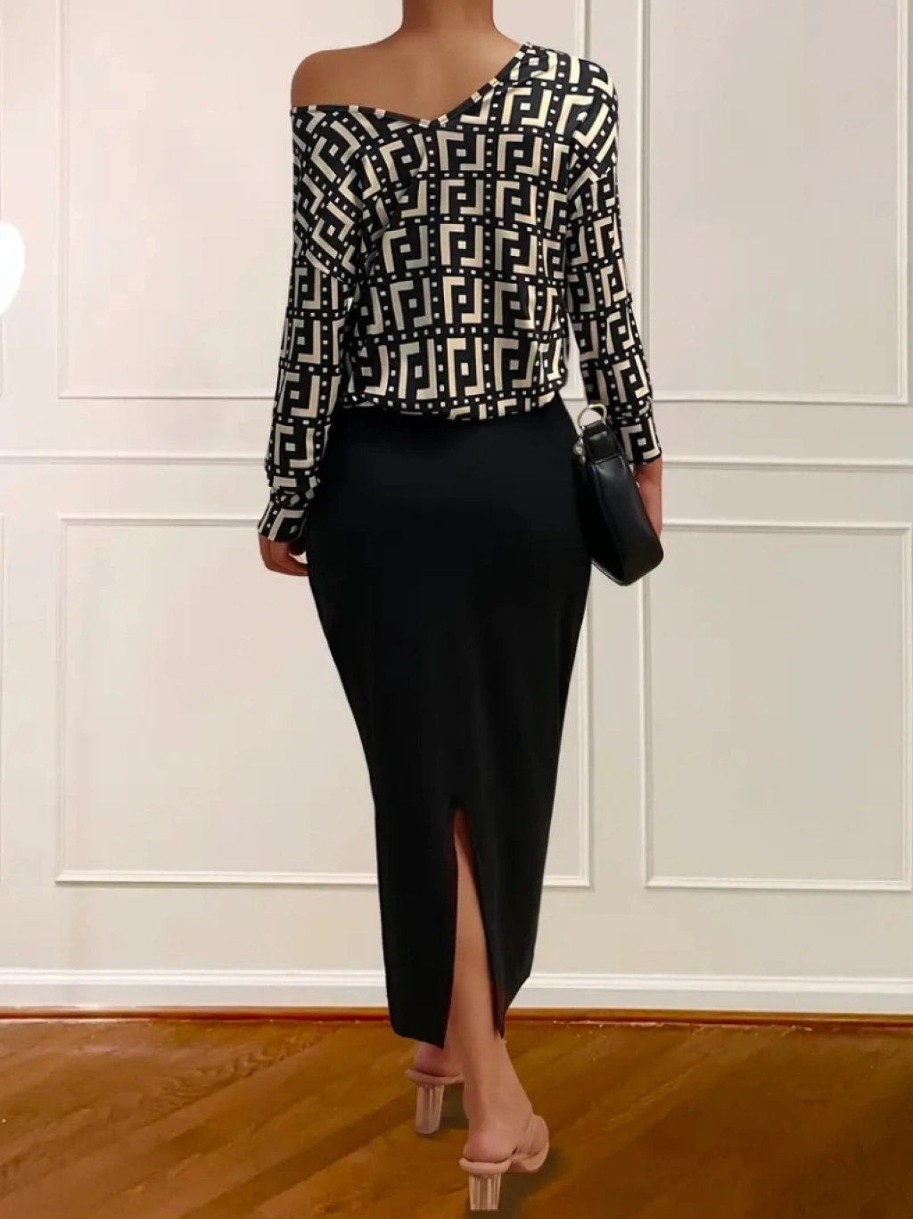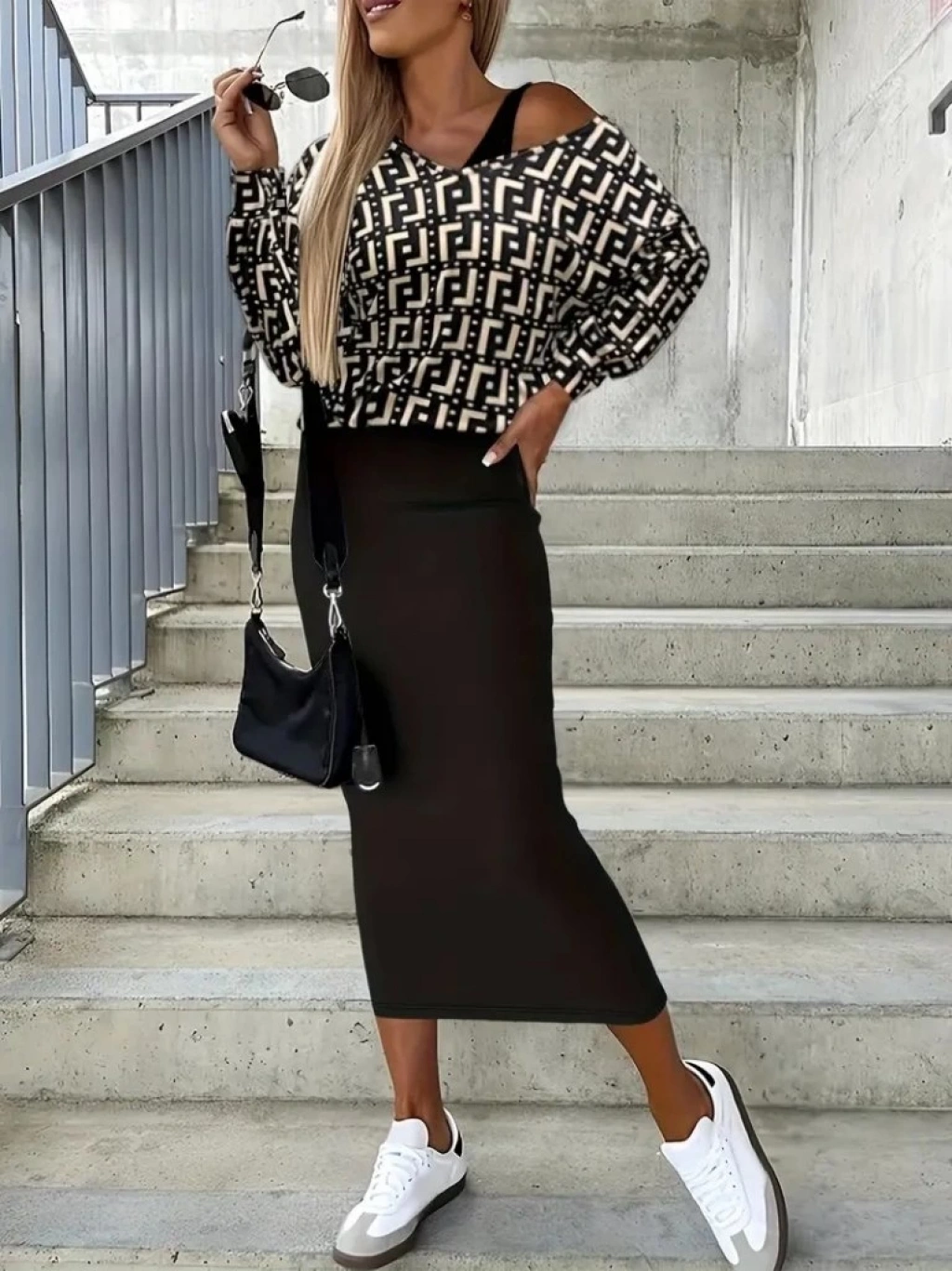 Kadın Uzun Kollu Askılı Yuvarlak Yakalı Yırtmaçlı Dalgıç Elbise Ile Yakalı Yunan Desenli Bluz Ikili Takım