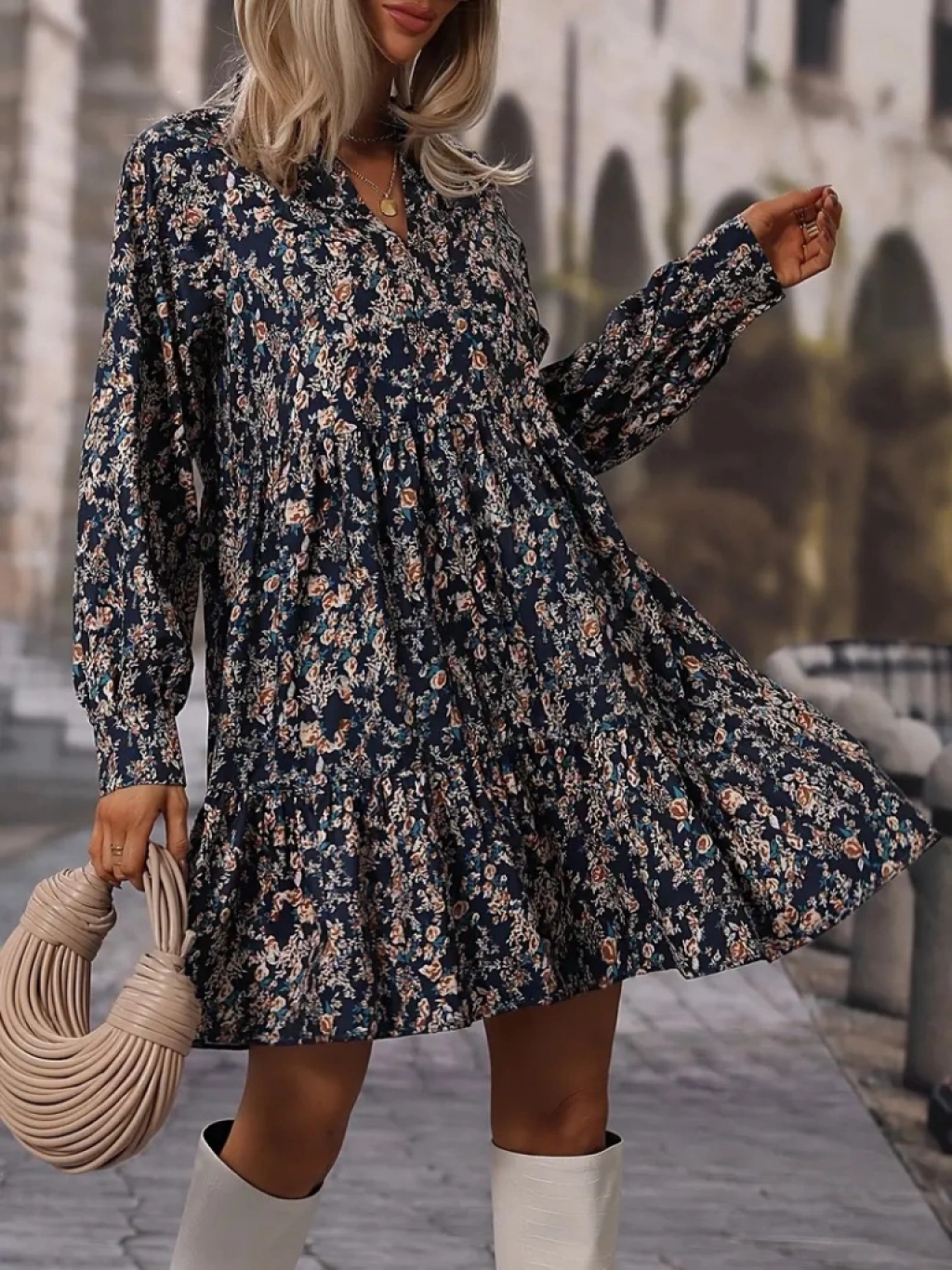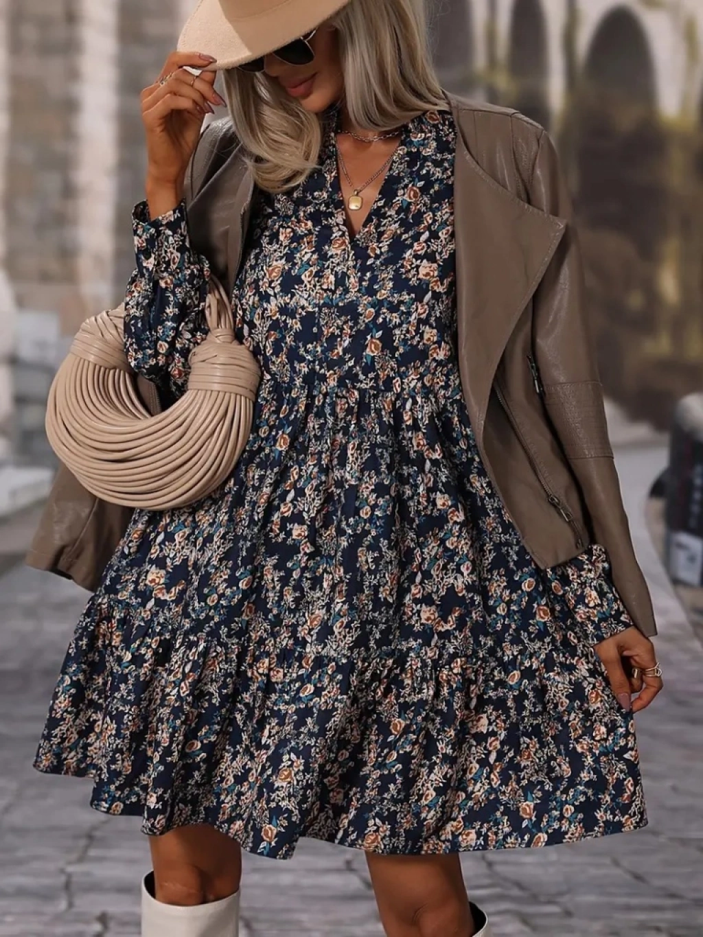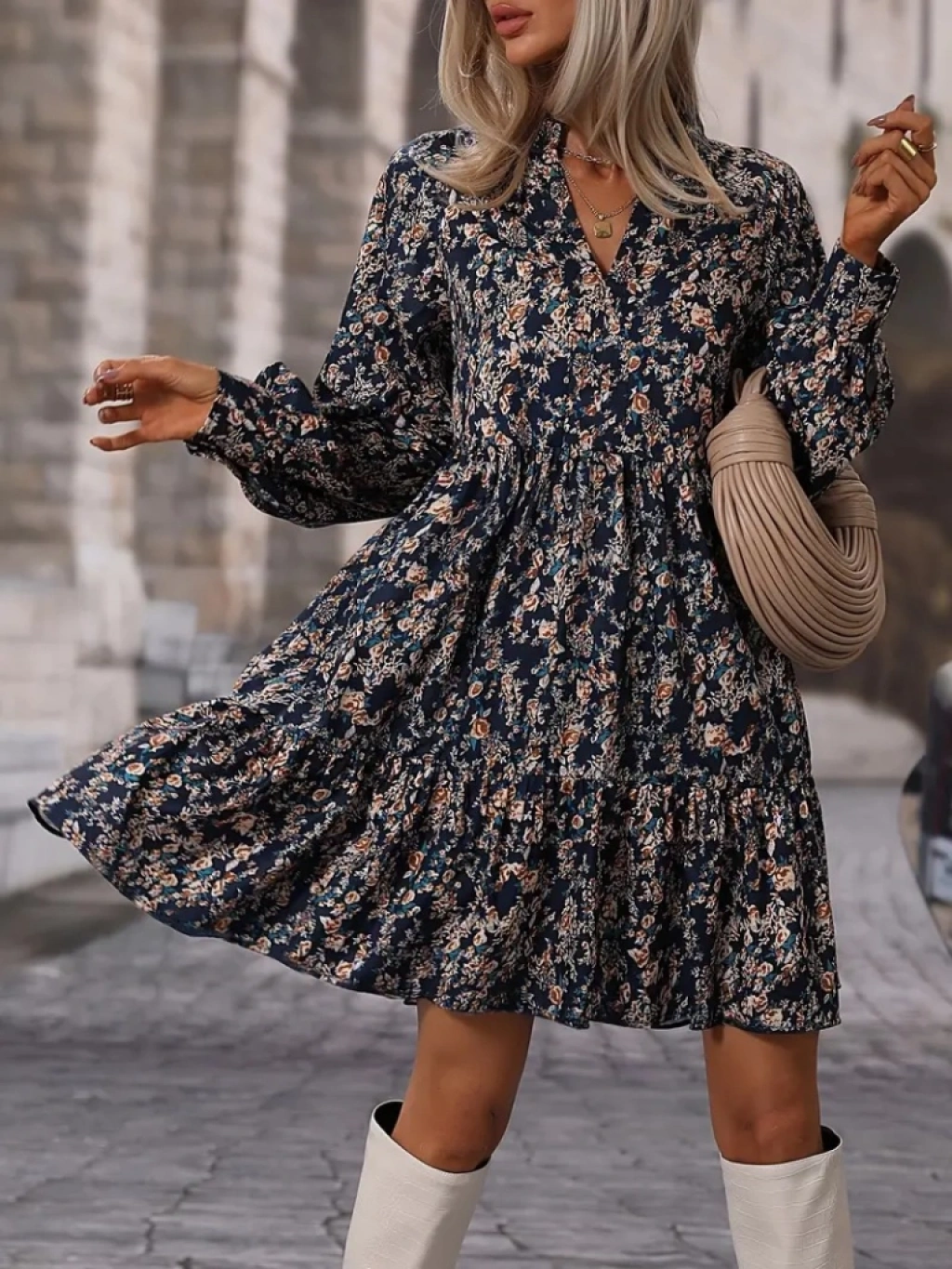 Kadın Uzun Kollu Hakim V Yakalı Desenli Volanlı Süprem Elbise