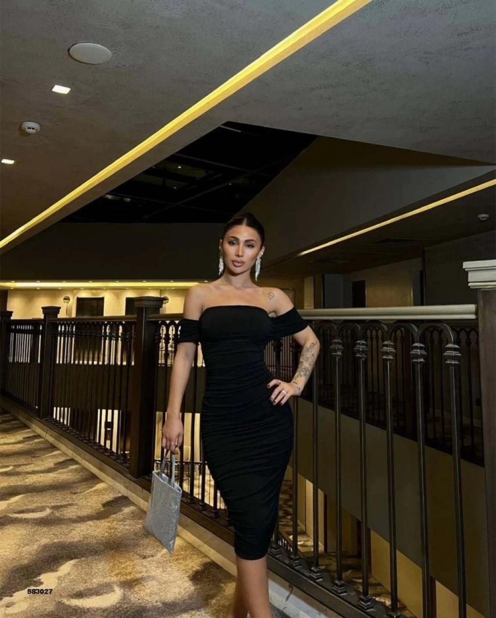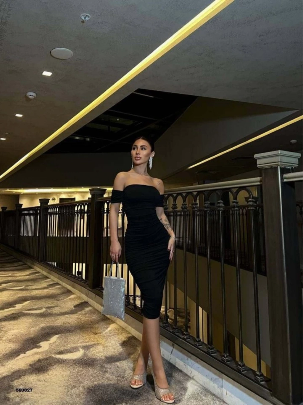 Kadın Madonna Yaka Sandy Kumaş Büzgü Detay Midi Boy Elbise