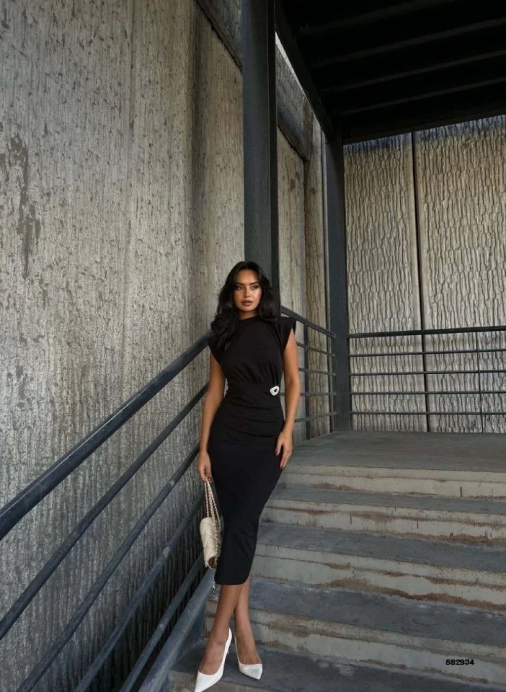Kadın Bisiklet Yaka Vatkalı Broş Detay Kısa Kol Midi Boy Elbise