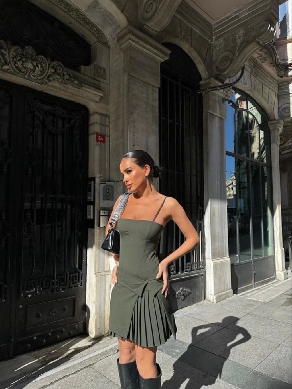 İki Parçalı Pileli Askılı Mini Elbise - Haki