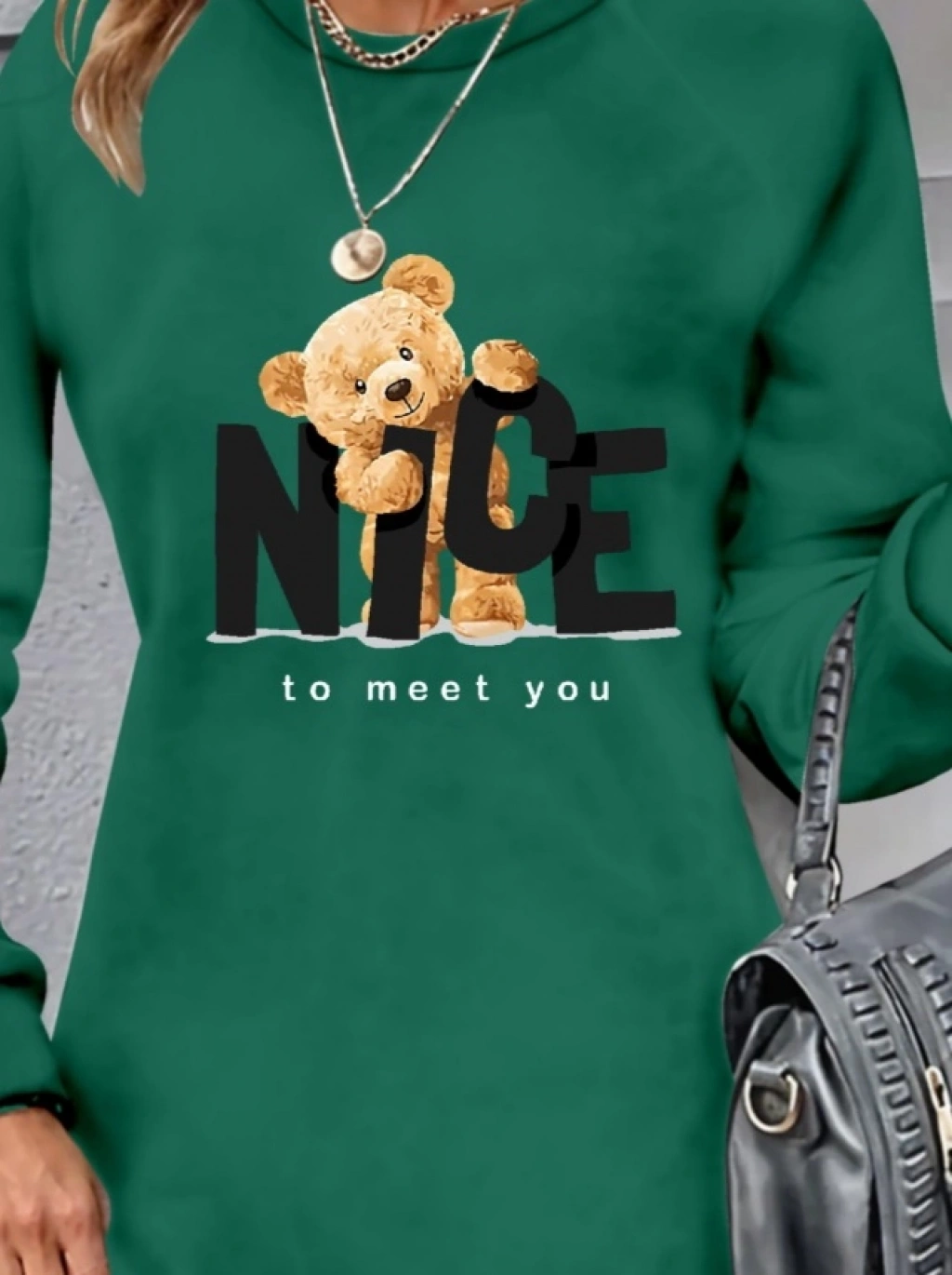 Kadın Uzun Kollu Bisiklet Yaka Ayı Desenli Viskon Iki Iplik Elbise