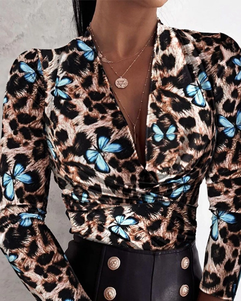 Kadın Uzun Kollu Kruvaze Yakalı Kelebek Desenli şardonlu Dalgıç Bluz