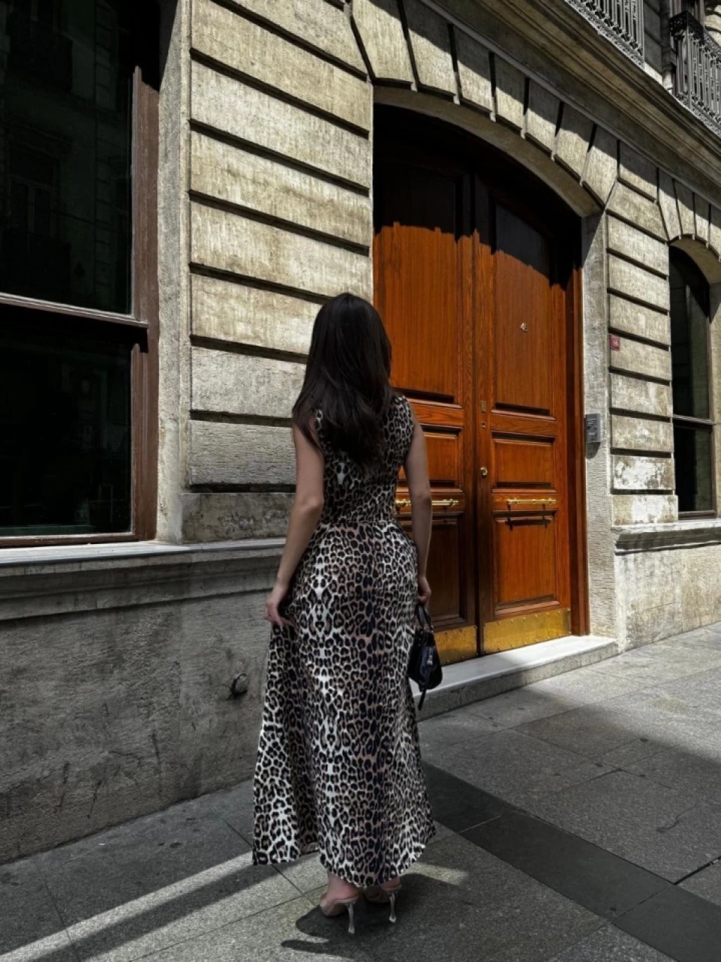 Leopar Desenli Fermuarlı Cepli Pileli Midi Elbise- Leopar