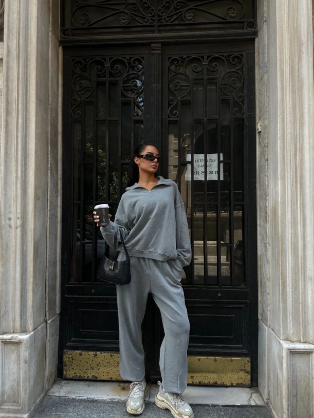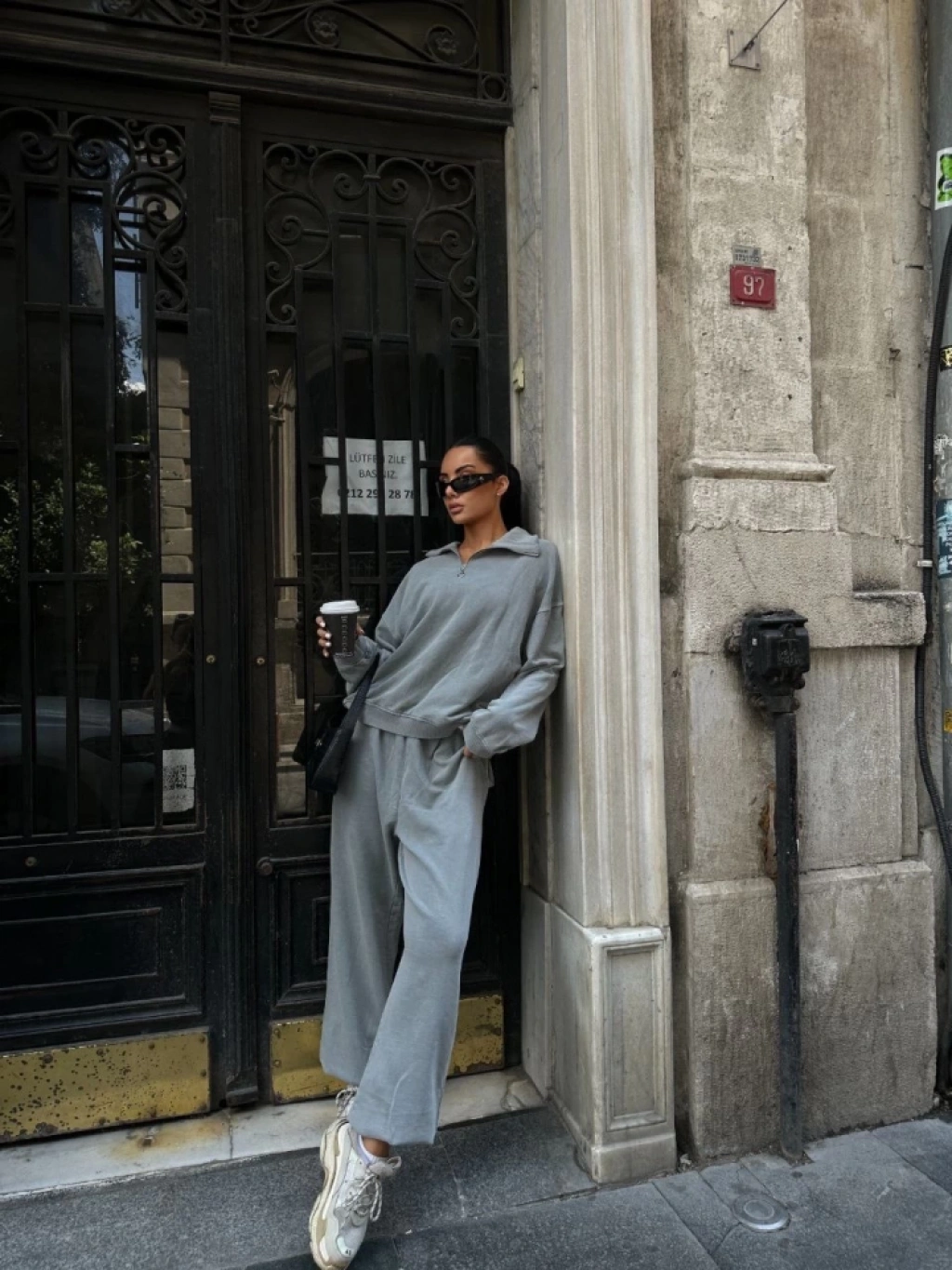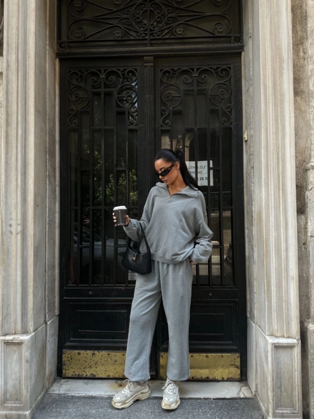 Yıkamalı Iki Iplik Kumaş Yakalı Fermuarlı Oversize Eşofman Takımı - Gri