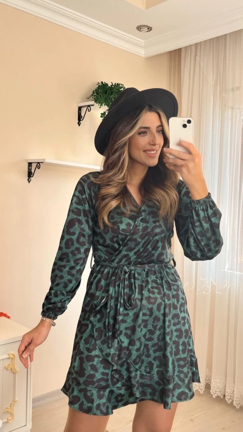 Kadın Uzun Kollu Kruvaze Yaka Belden Kuşaklı Leopar Desenli Dalgıç Elbise