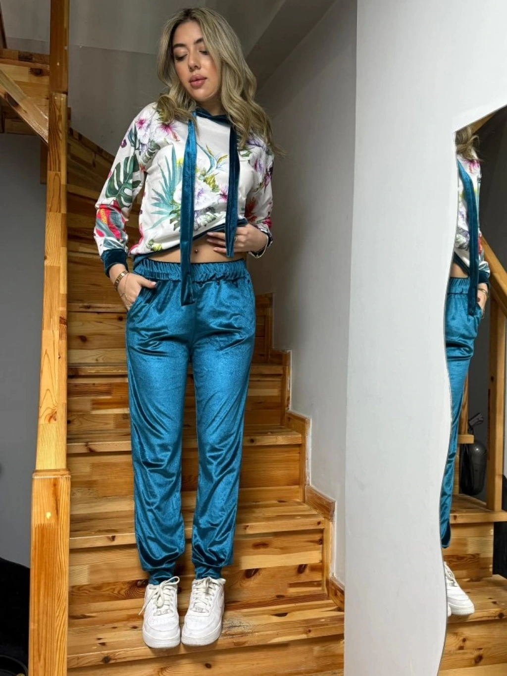 Kadın Kadife Kumaş Uzun Kollu Kapüşon Detay çiçek Baskılı Sweat Ve Pantolon Ikili Takım