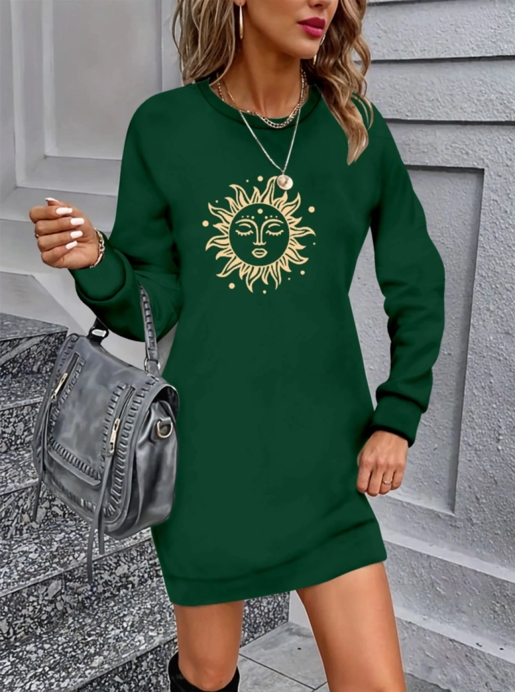 Kadın Uzun Kollu Bisiklet Yaka Güneş Desenli Viskon Iki Iplik Elbise