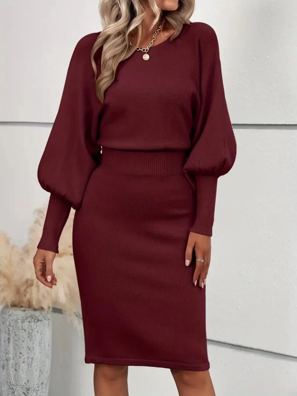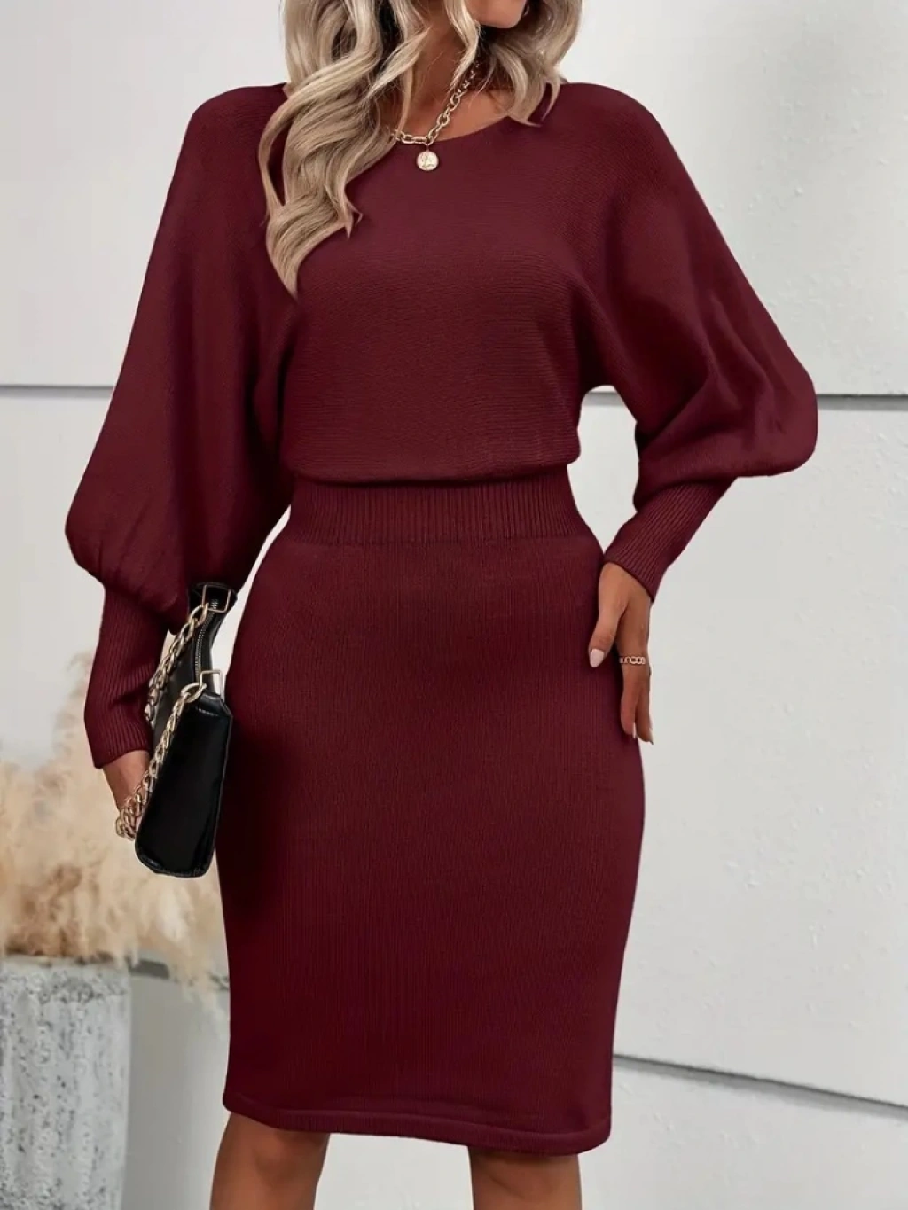 Kadın Uzun Yarasa Kollu Yakası Açık Belden Oturtmalı Kısa Triko Elbise