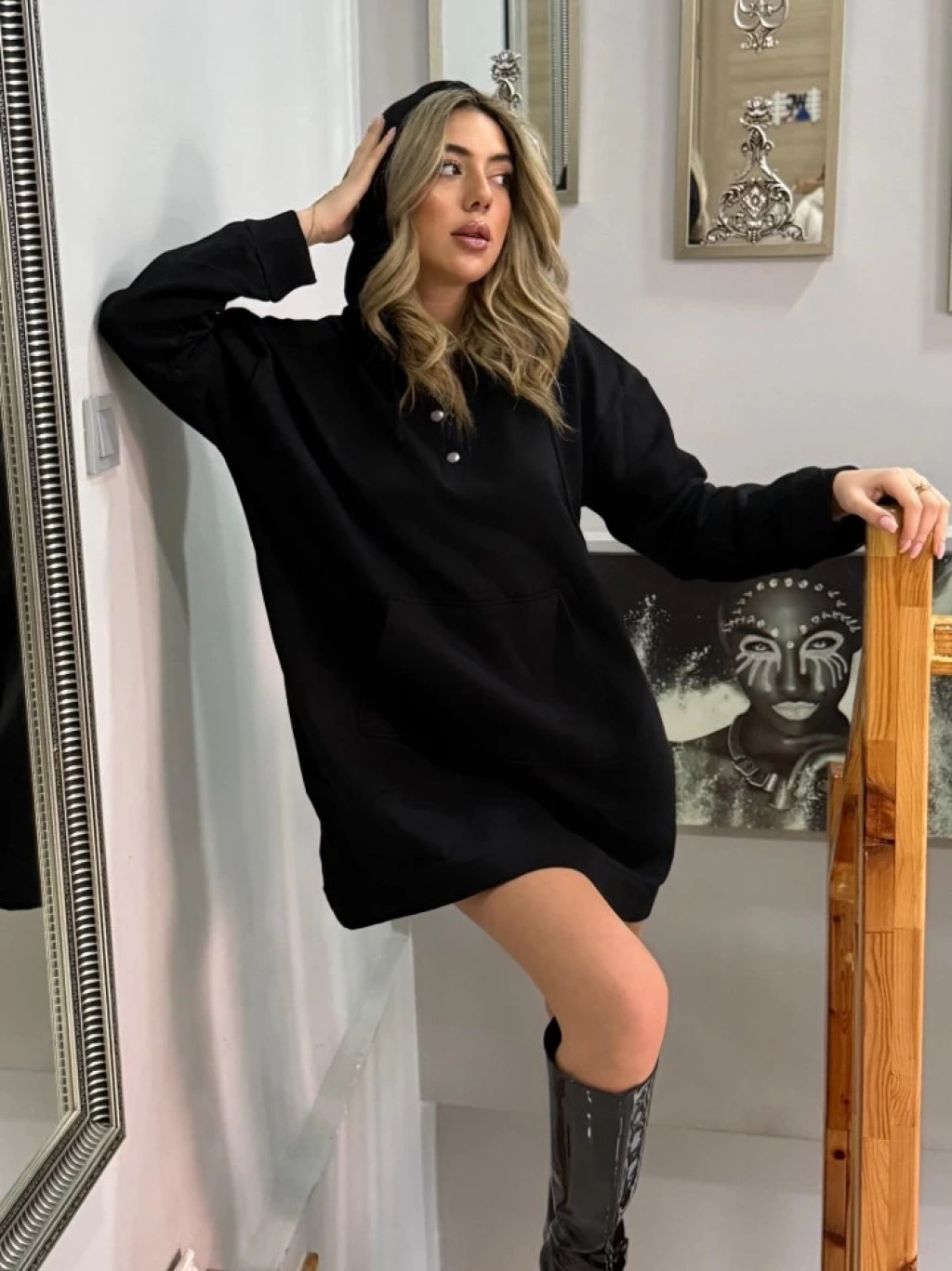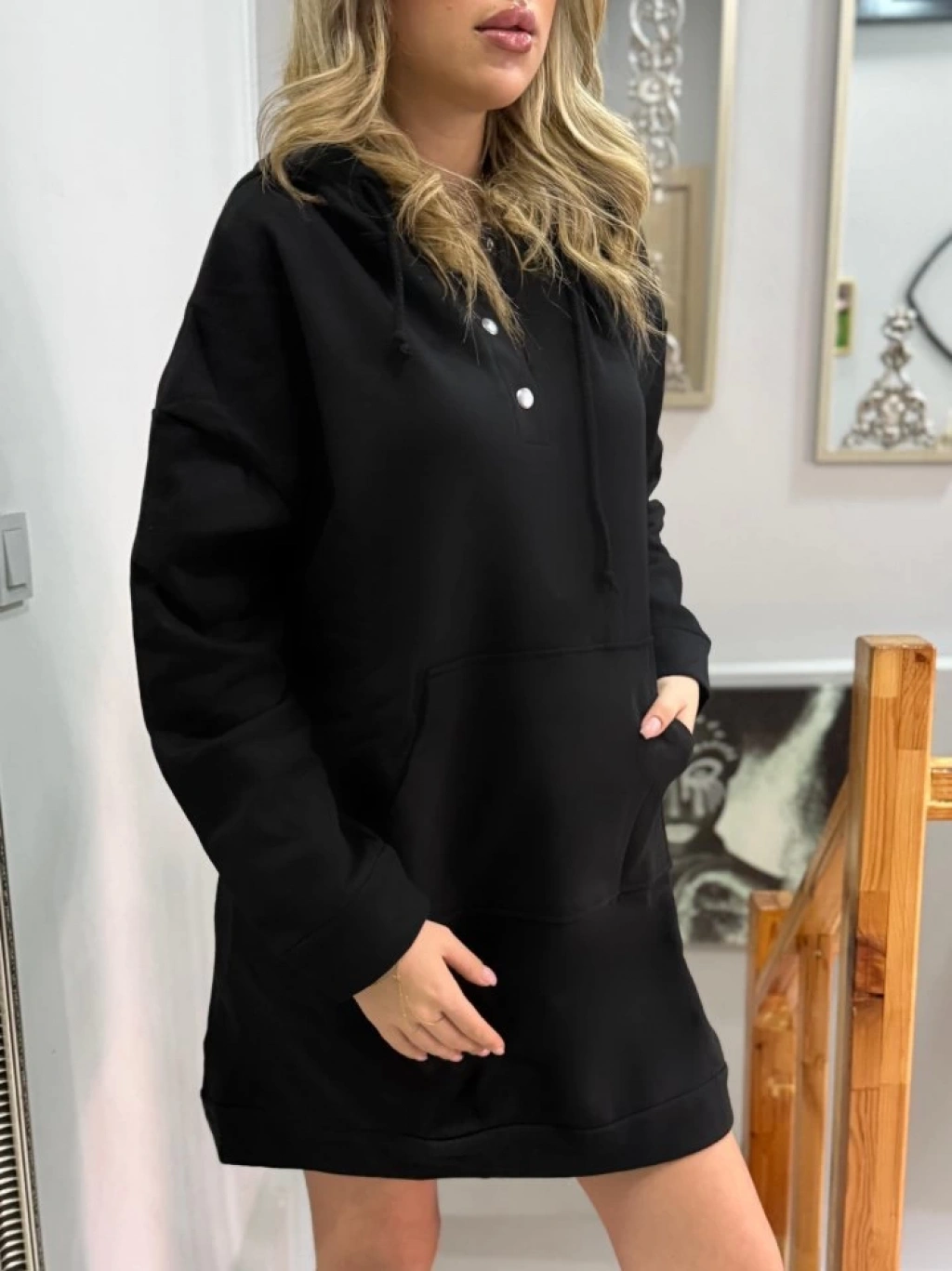 Kadın Uzun Kollu Kapşonlu Bağcıklı önden Düğmeli Ve Cepli Iki Iplik şardonlu Elbise