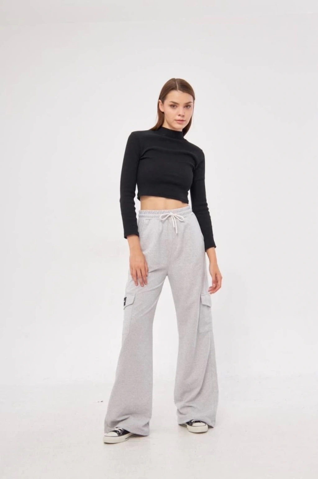 Kargo Cepli Palazzo Oversize Kesim İki Iplik Bol Paça Eşofman Altı Pantalon - Gri