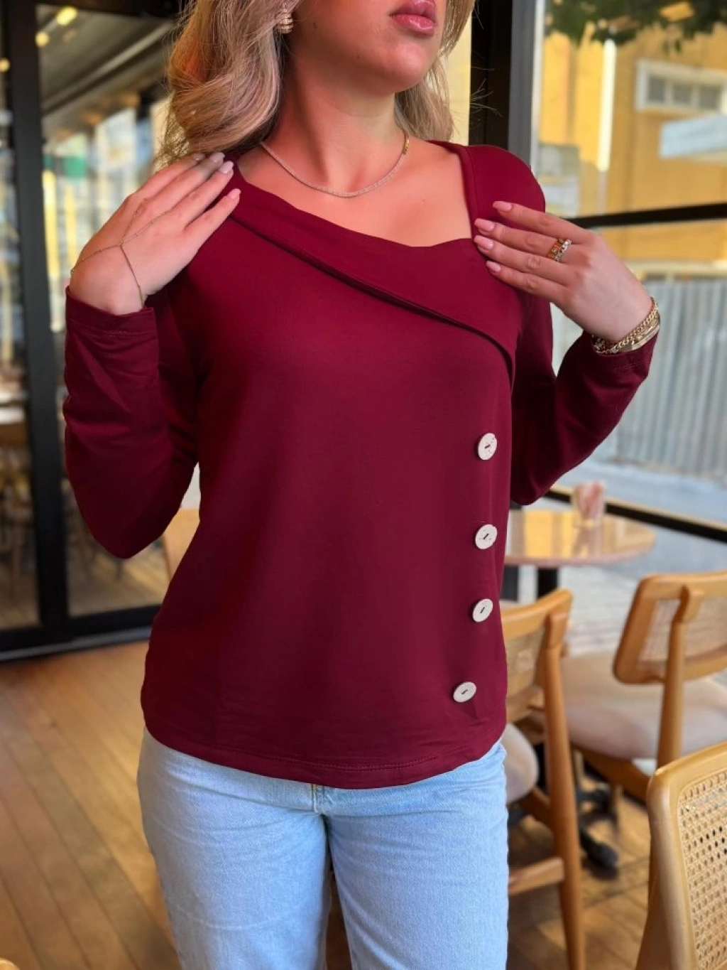 Kadın Uzun Kollu Geometrik Yaka Detay Yandan Düğmeli Viskon Iki Iplik Bluz