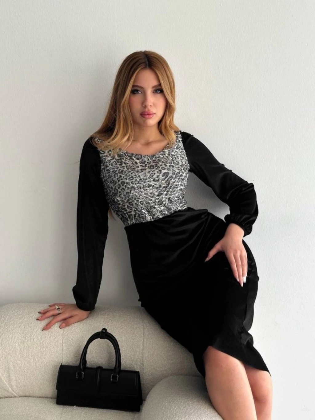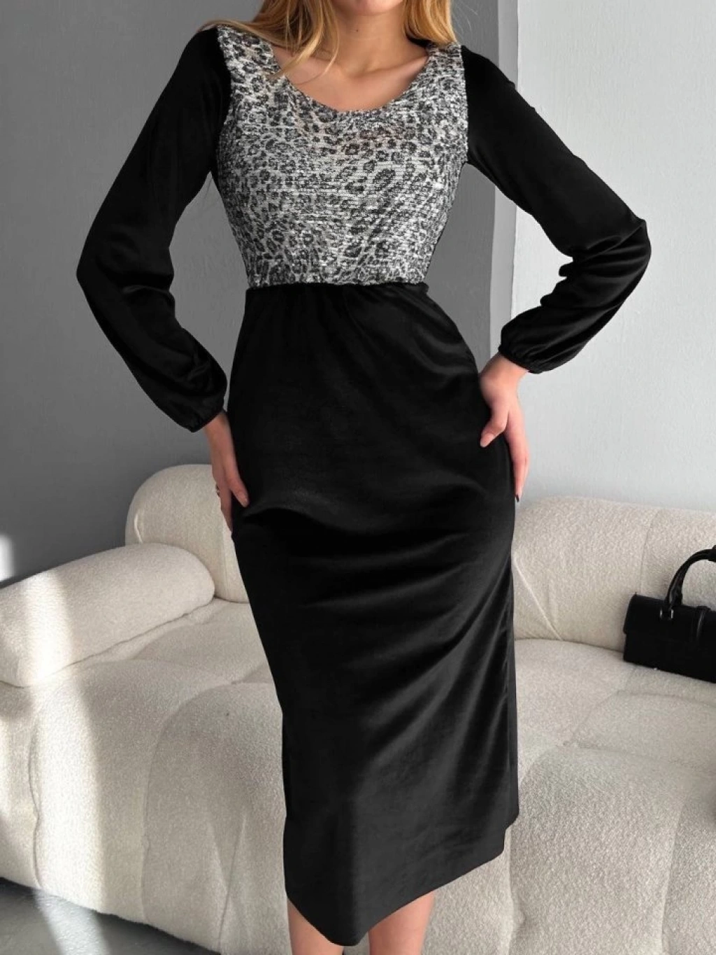 Kadın Fırsat ürünü Leopar Desen Pul Payet Işlemeli Midi Boy Kadife Kumaş Elbise