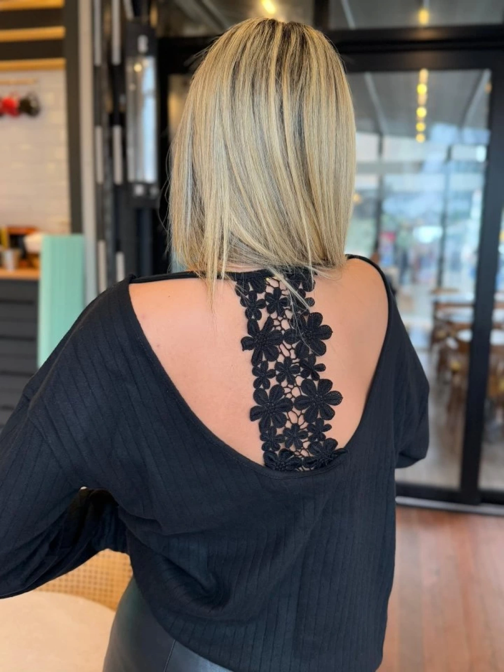Kadın Uzun Kollu V Yakalı Pencere Sırt Dantel Detaylı Kalın Fitilli Kaşkorse Bluz