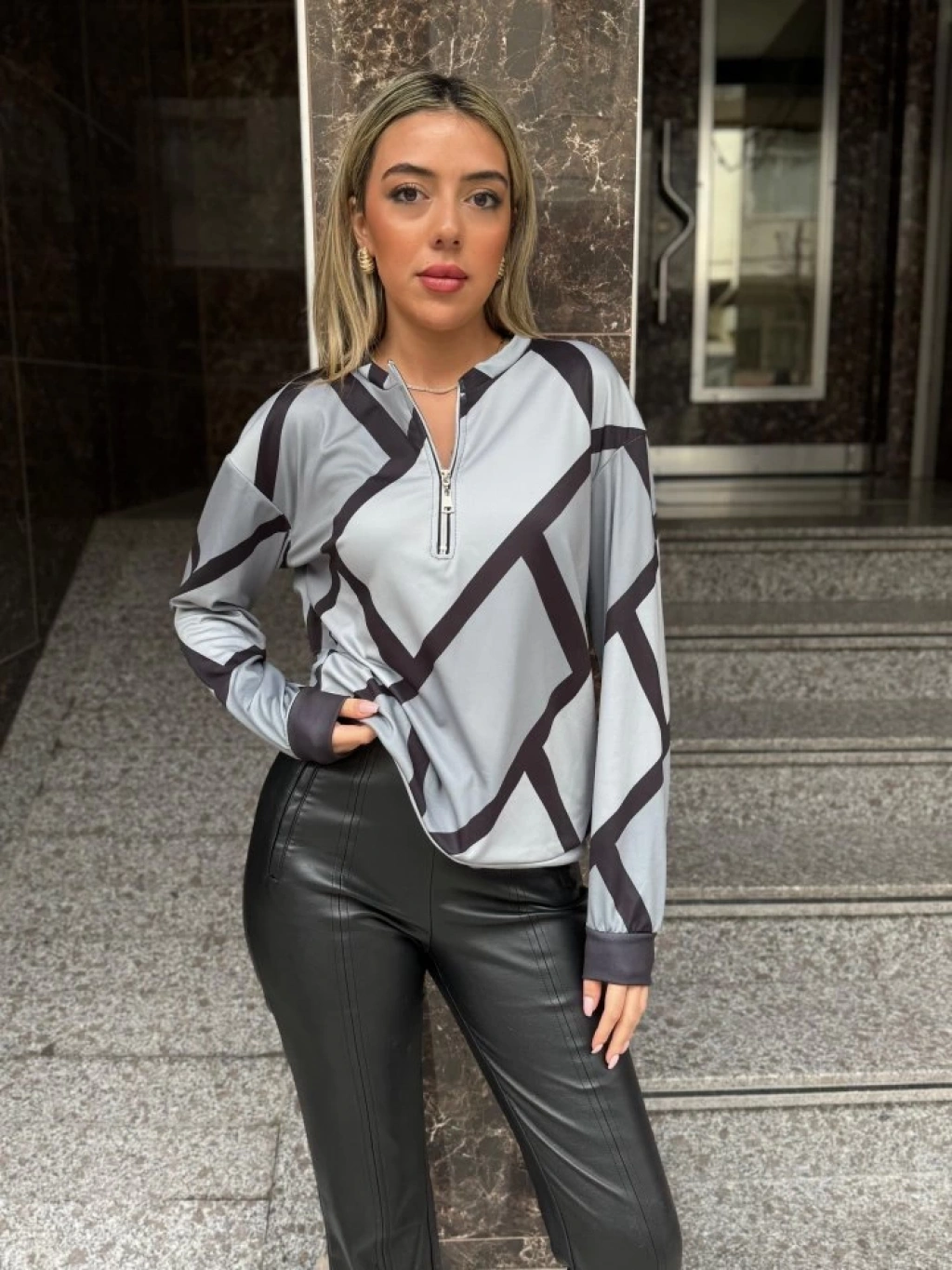Kadın Uzun Kollu Yuvarlak Yaka Fermuarlı Desenli şardonlu Bluz