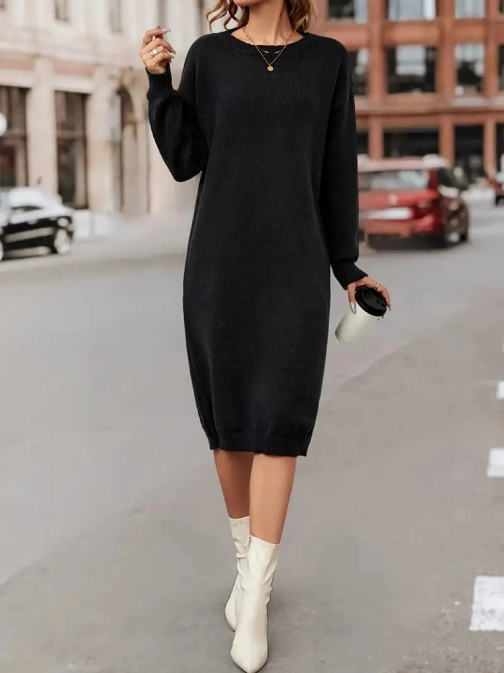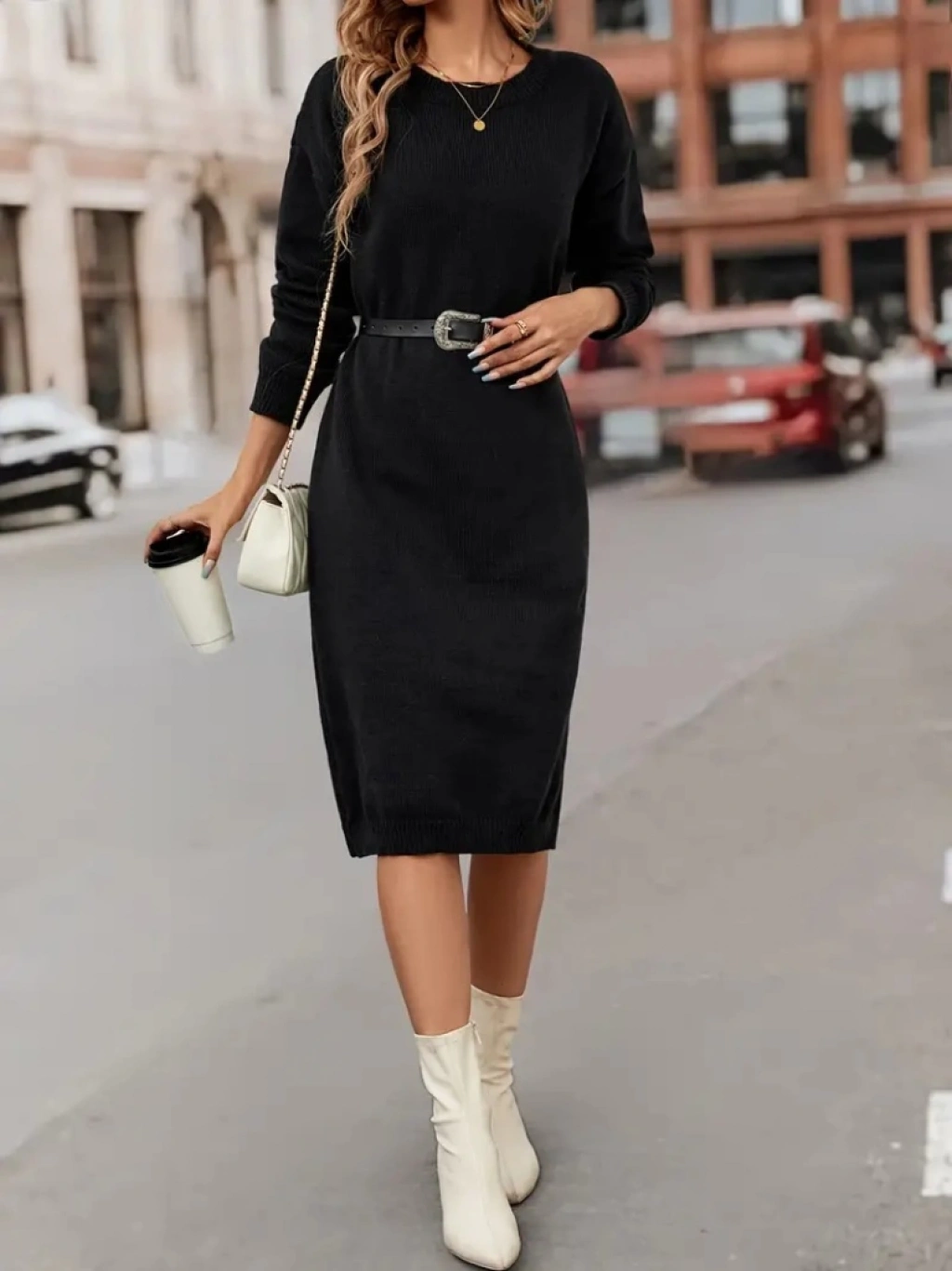 Kadın Uzun Kollu Bisiklet Yaka Yandan Yırtmaçlı Midi Triko Elbise(kemersiz)