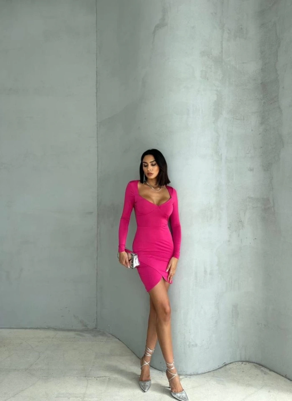 Kadın Uzun Kollu Göğüs Ve Sırt Dekolteli Kruvaze Etek Detay Fırsat ürün Mini Elbise