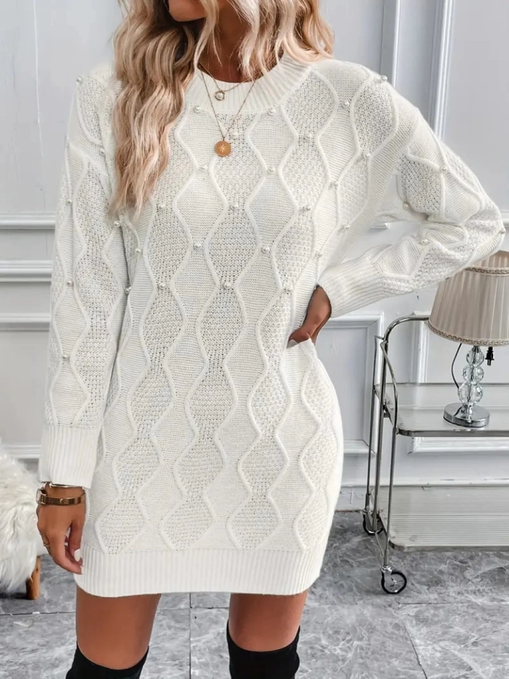 Kadın Uzun Kollu Bisiklet Yaka Desenli Triko Elbise