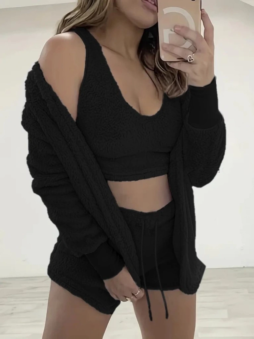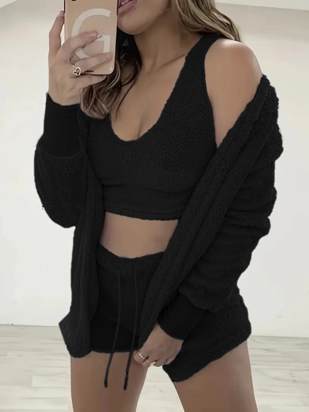 Kadın Uzun Kollu Ceket, Askılı Peluş Bluz Ve şort üçlü Takım