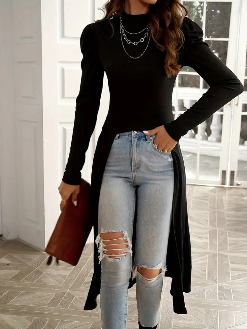 Kadın Uzun Balon Kollu Yarı Balıkçı Yaka önü Açık Kaşkorse Tunik