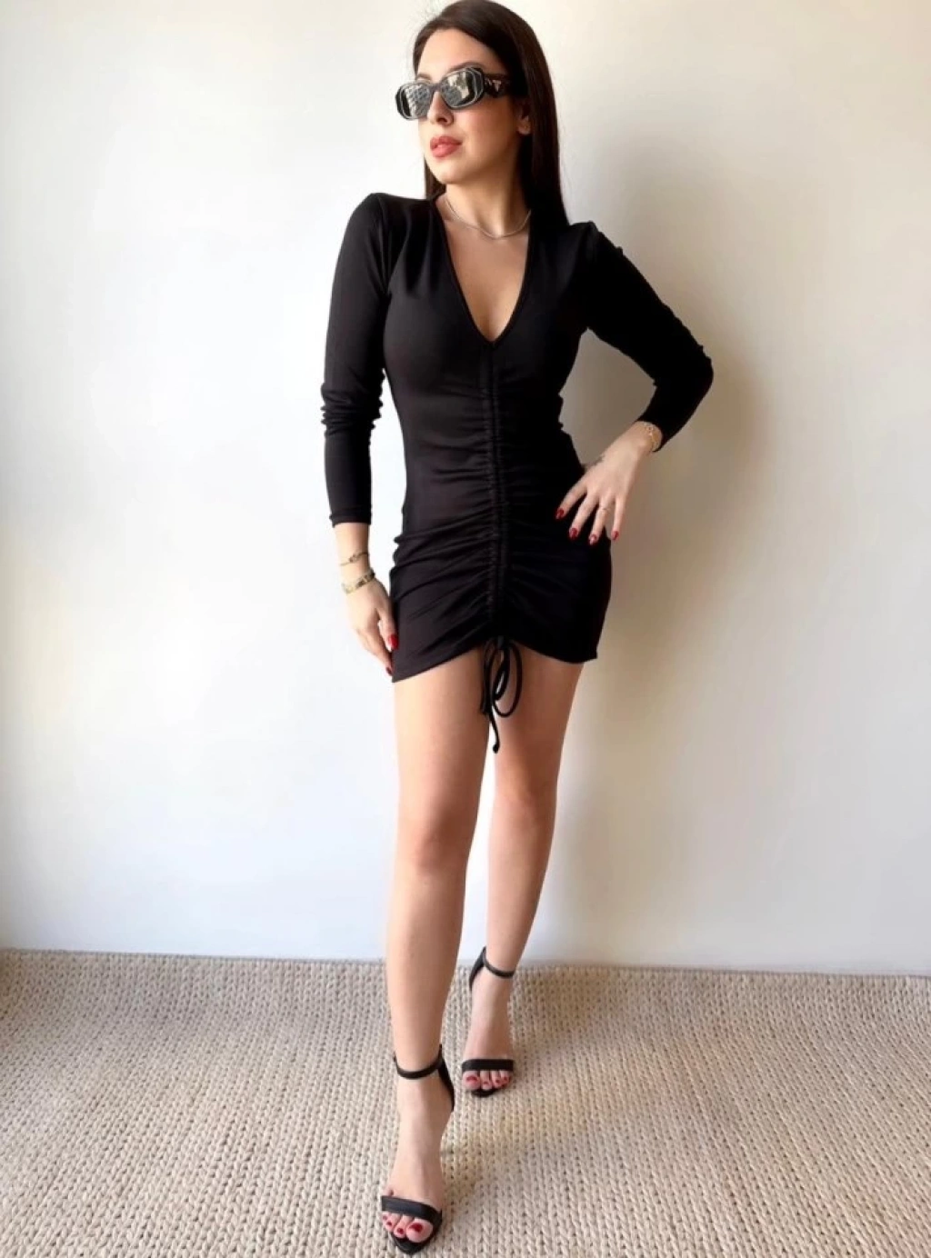 Kadın V Yaka önü Asansör Büzgü Detay Fırsat ürün Mini Elbise