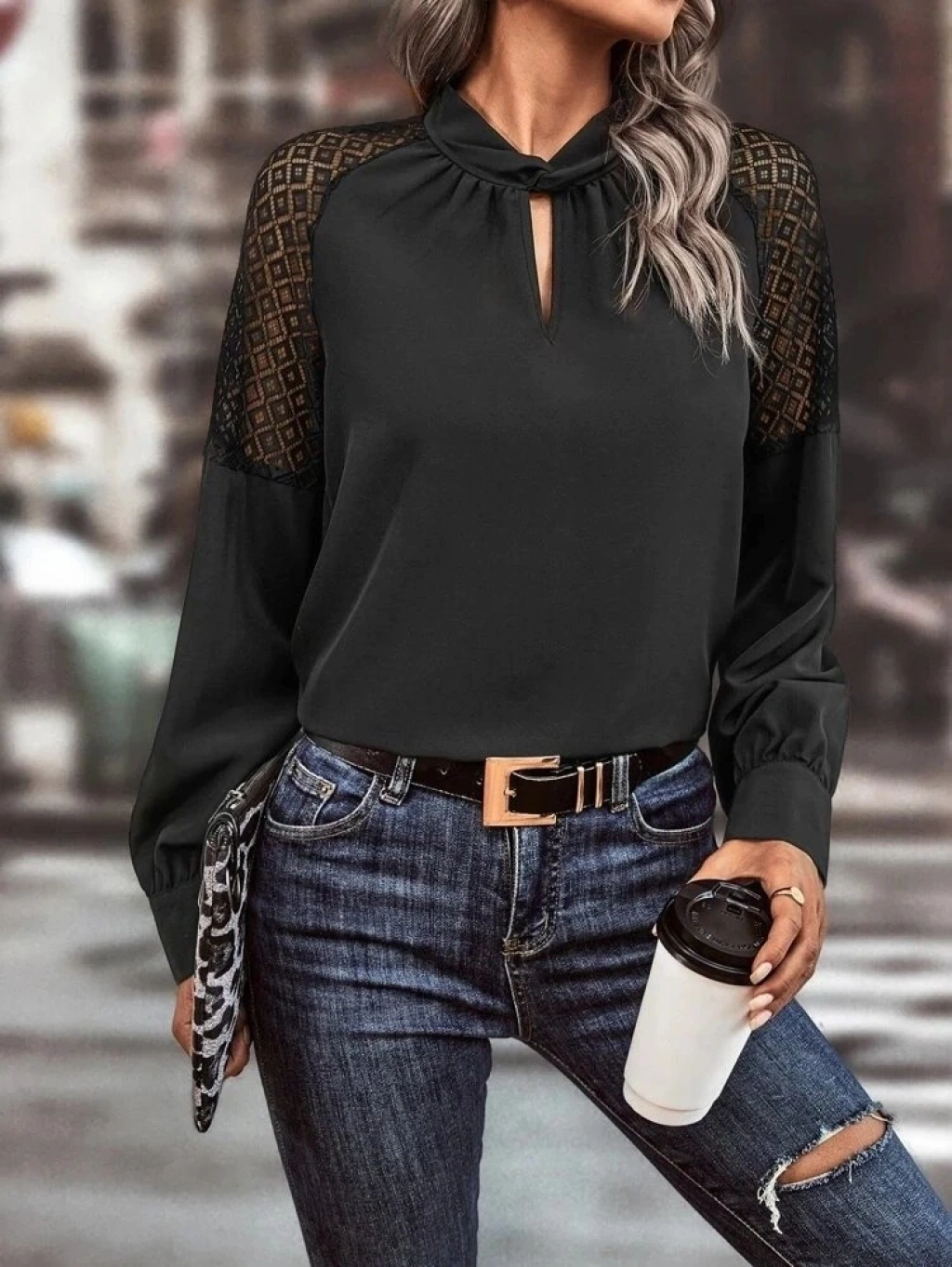 Kadın Uzun Kollu Anahtar Deliği Yaka Reglan Kol Dantel Detaylı Ithal Krep Bluz