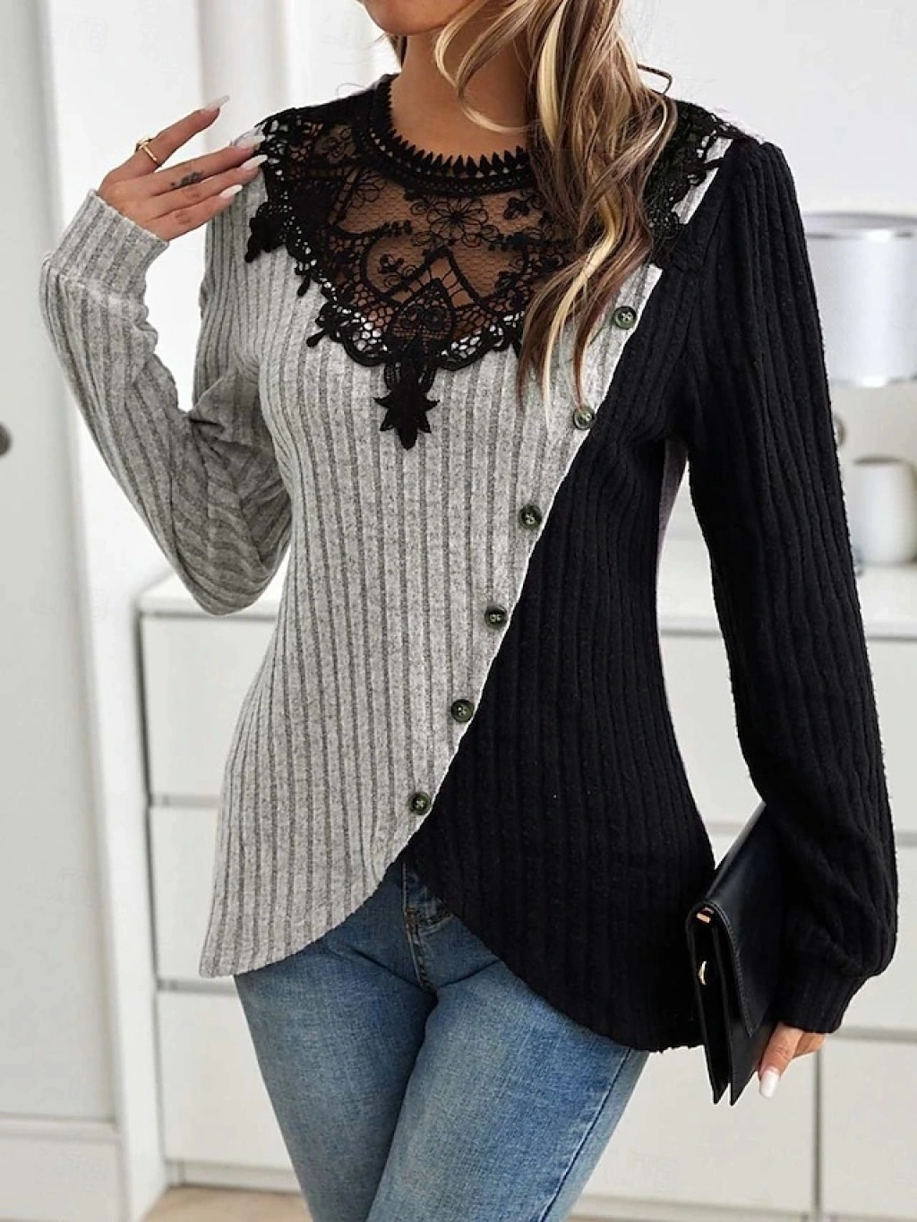 Kadın Uzun Kollu Dantel Yaka Yandan Düğmeli şardonlu Kaşkorse Bluz