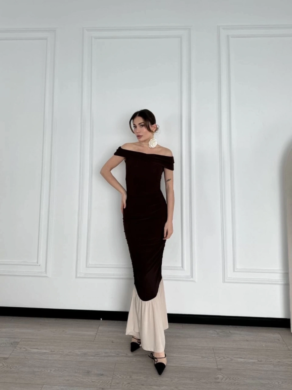 Striptiz Omuzlu Uzun Elbise- Kahve