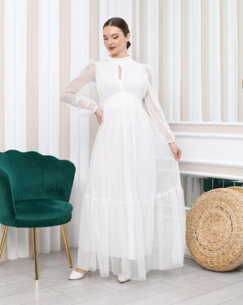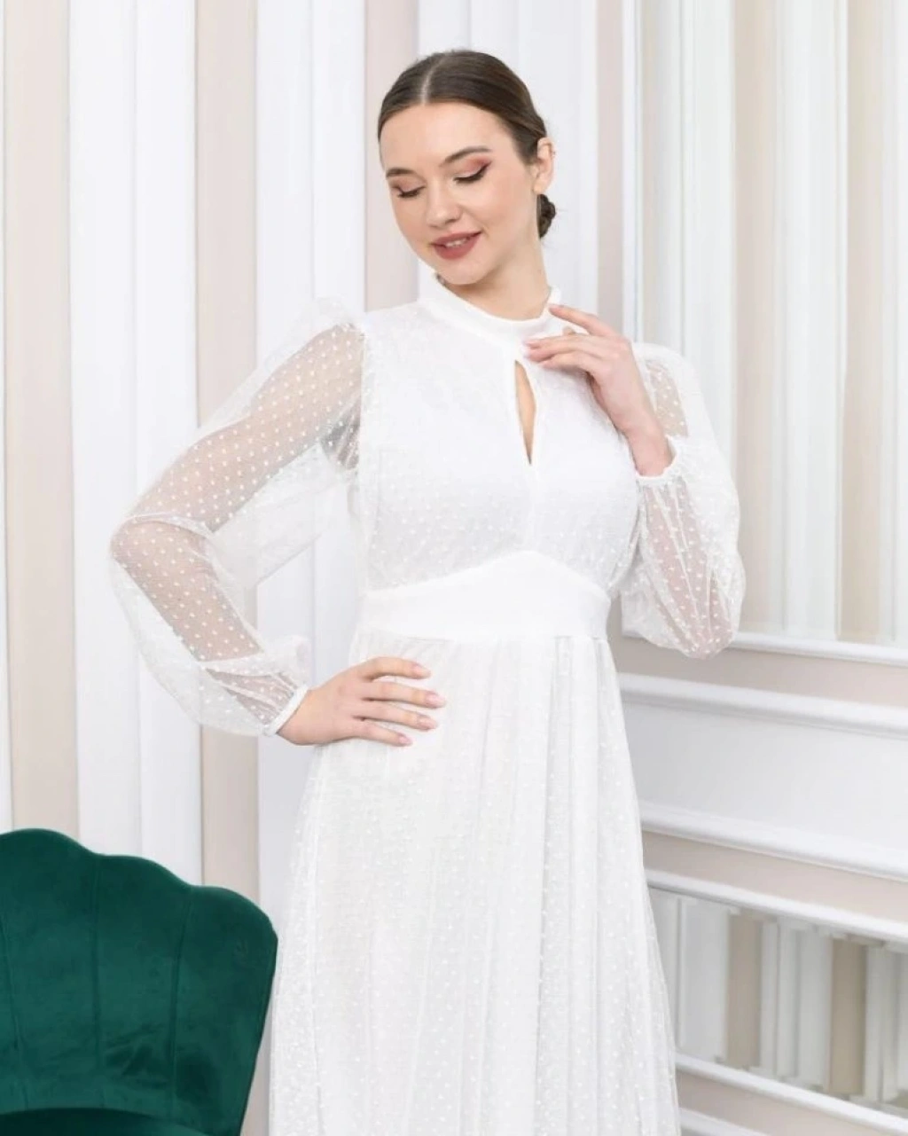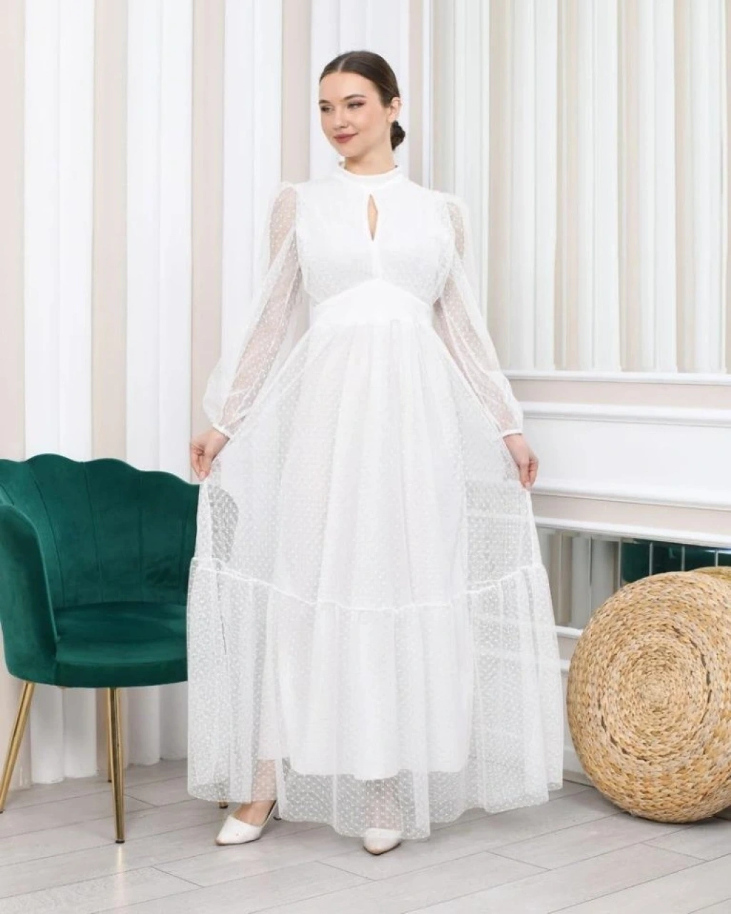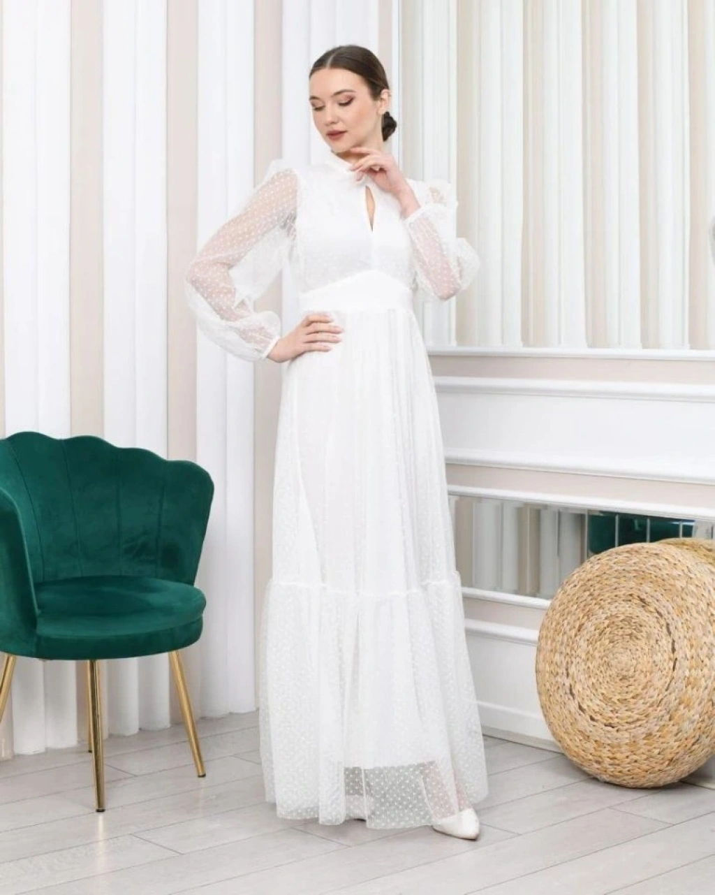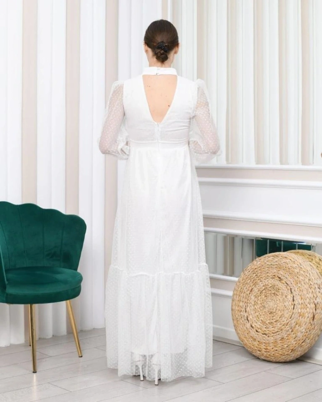 Kadın Damla Yaka Sırt Dekolteli Astarlı Tül Elbise