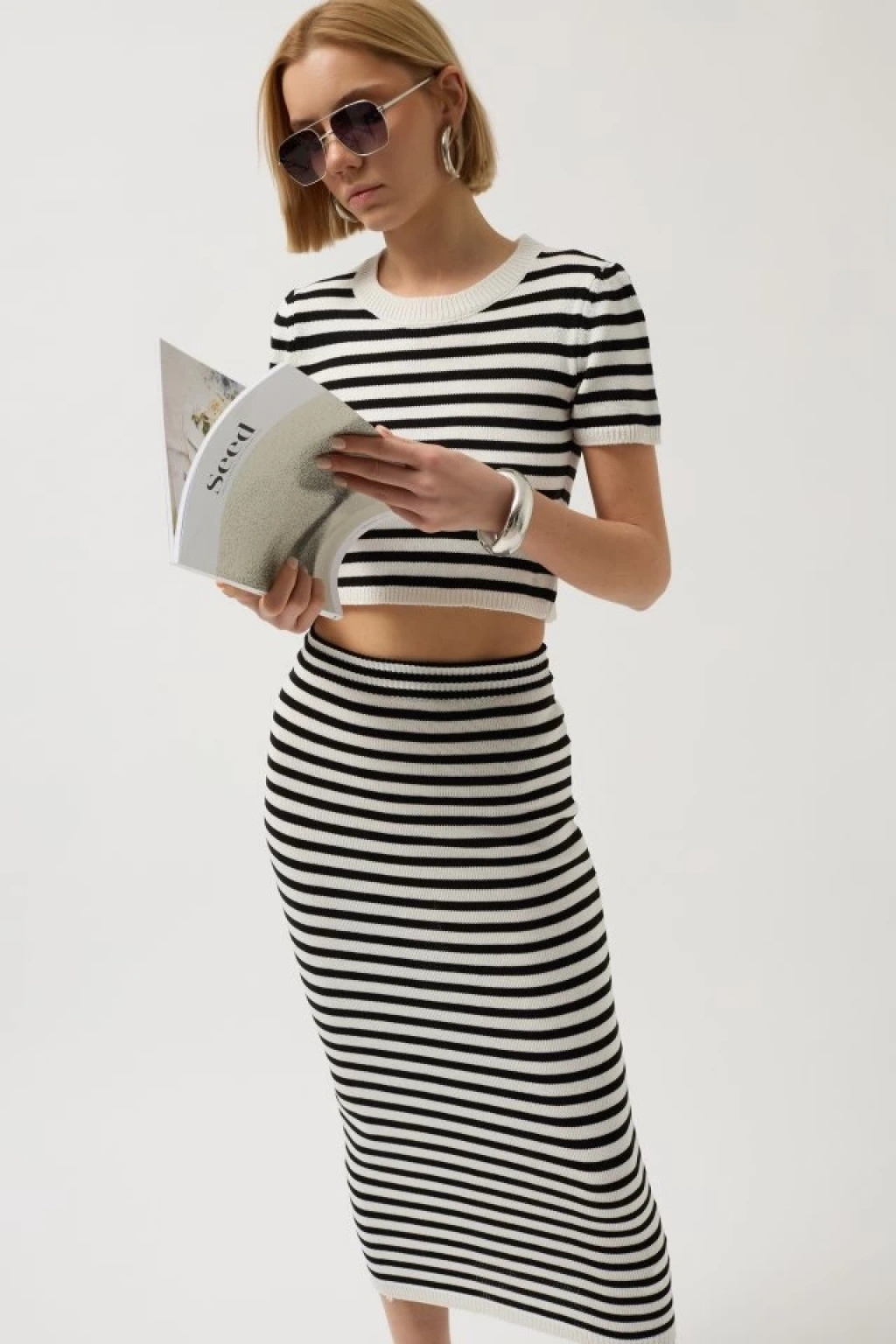 Çizgili Midi Dokulu Etek