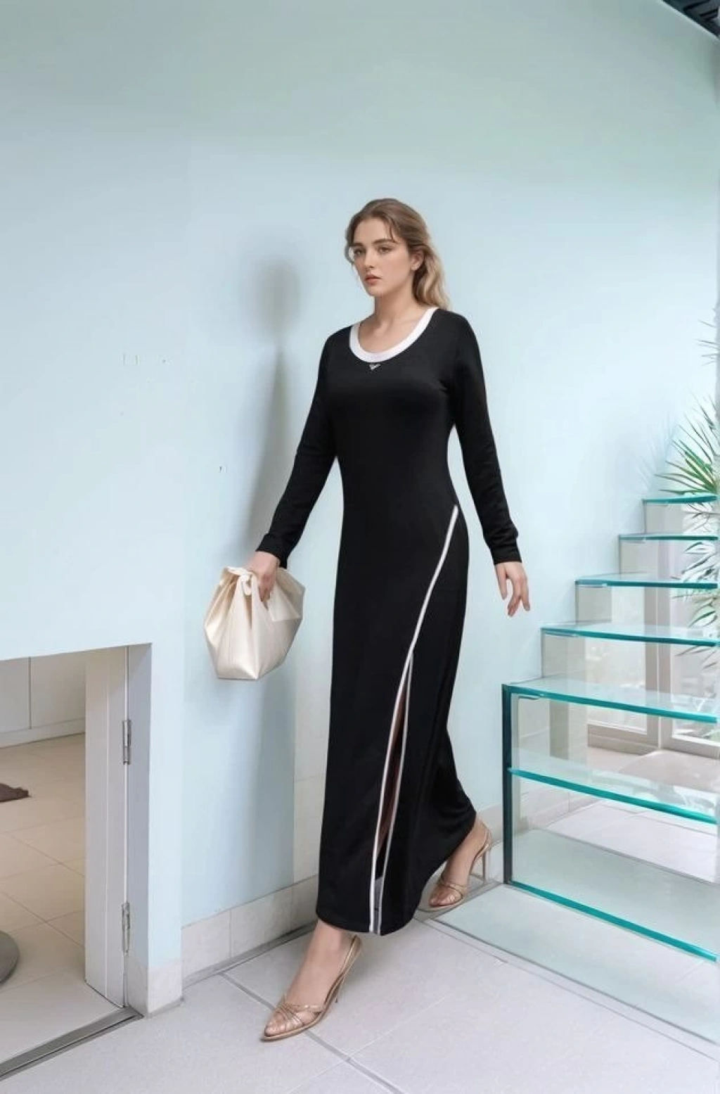 Kadın Uzun Kollu Yuvarlak Ribana Yaka Yırtmaçlı Uzun Viskon Iki Iplik Elbise