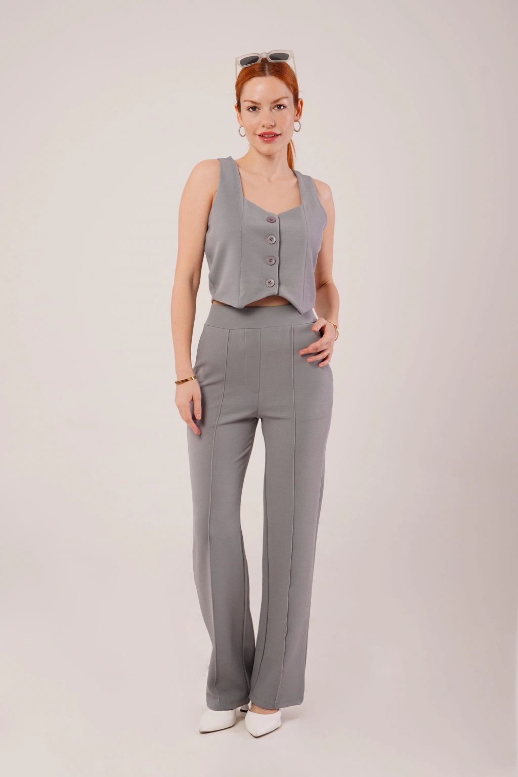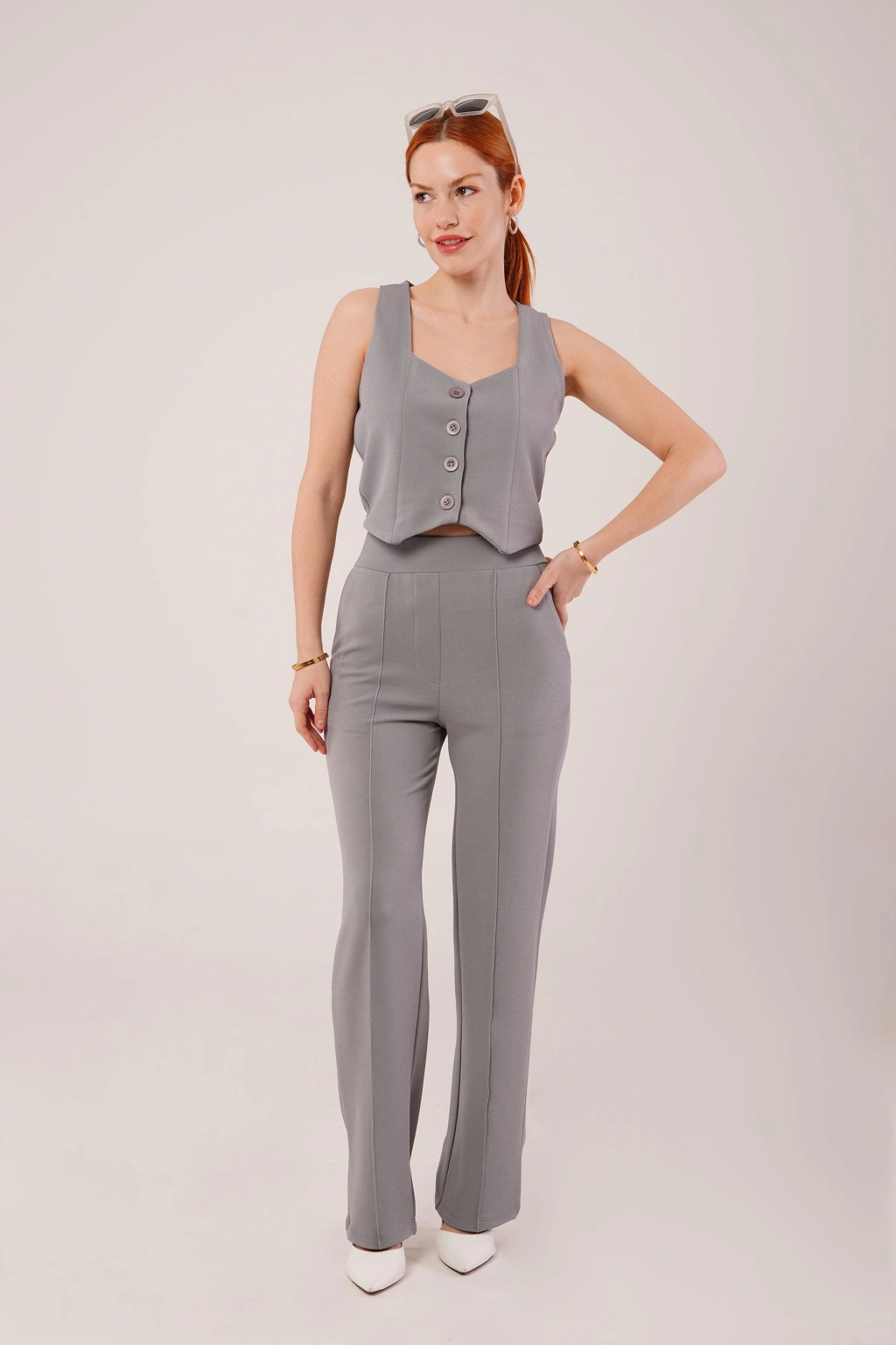 Kalın Askılı Düğmeli Yelek Ve Pantolon Gri Takım
