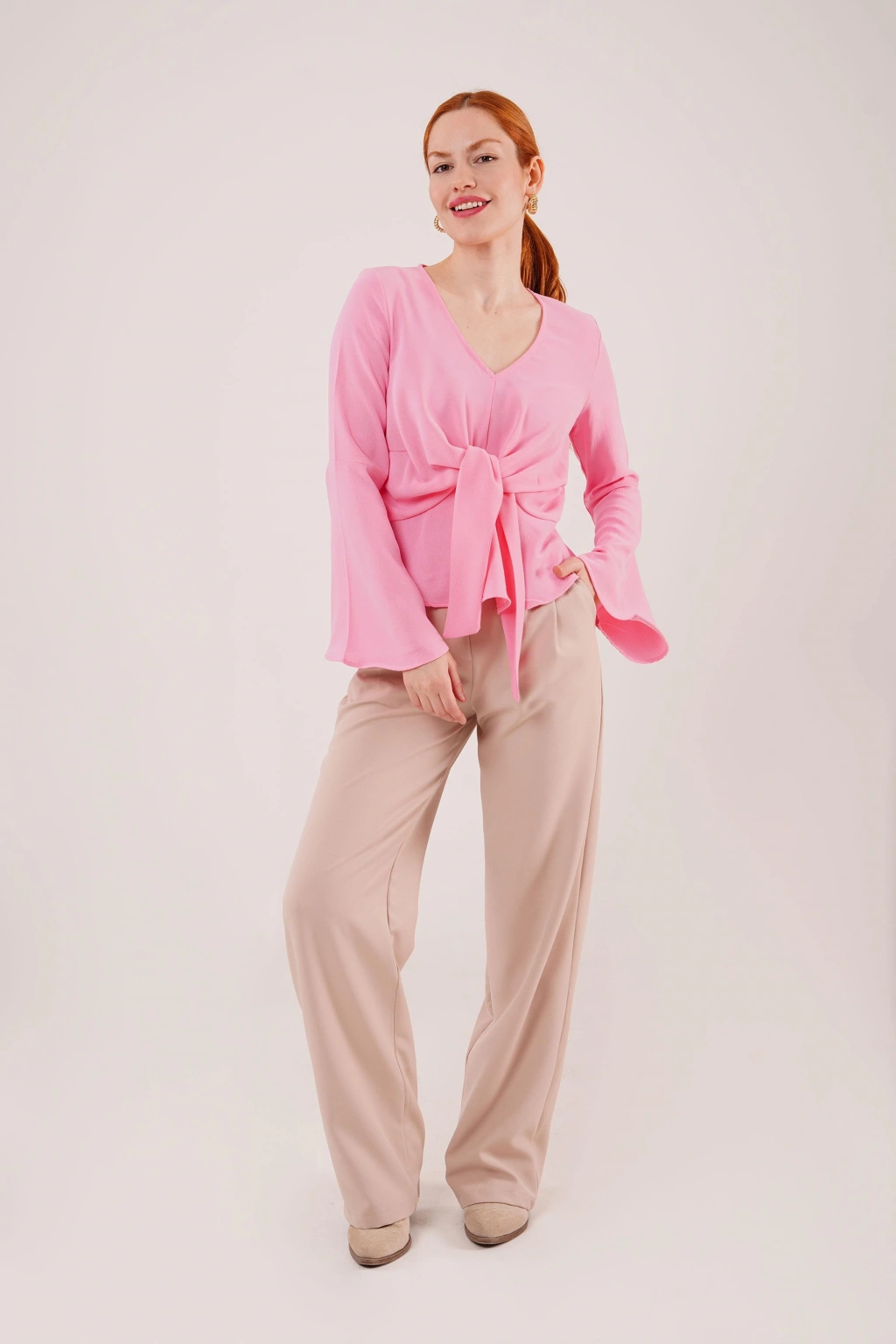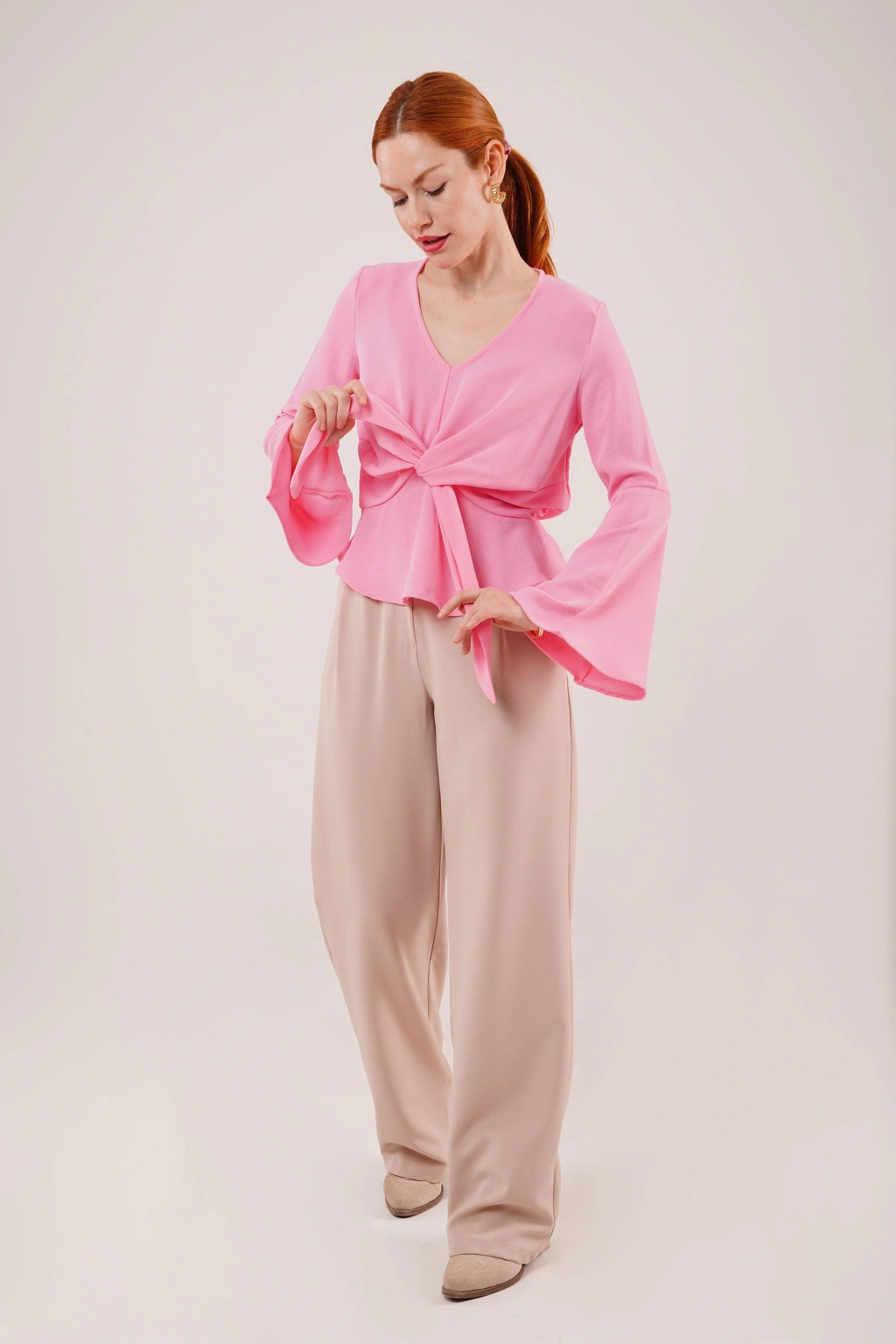 Ön Bağlamalı Volan Kol Pembe Bluz